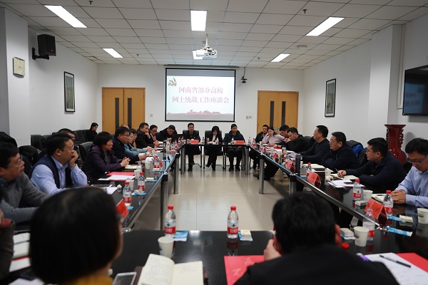 1月22日下午,河南省部分高校网上统战工作座谈会在我校东风校区图书馆第三会议室举行。省委统战部党外知识分子工作处处长王亚伟、副处长吴炜,省教育厅统战处处长张水潮、副处长高峰出席座谈会,郑州大学、河南大学、华北水利水电大学、河南财经政法大学、河南中医药大学、18新利直播 、郑州航空管理学院、河南广播电视大学,共八所高校统战部长、专家学者及党外知识分子代表30余人参会。会议由省委统战部党外知识分子工作处副处长吴炜主持。