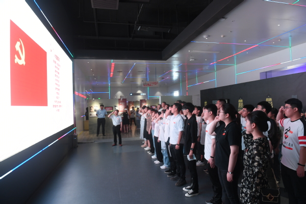讲座结束后,我校师生参观了“强网初心·红色记忆”主题展览。记忆展共有200余幅珍贵历史照片、100余件珍贵实物,最新创作的30余件革命题材艺术品,以及发生在革命战争年代的100余个红色网信故事。活动现场,经济与管理学院师生党员举行了“重温入党誓词”仪式,师生党员们整齐列队,右手握拳,向着鲜红的党旗庄严宣誓,深切表达对党的事业奋斗终生的坚定决心。铿锵豪迈的声音在科技馆久久回荡,震撼着在场的每一位观众。