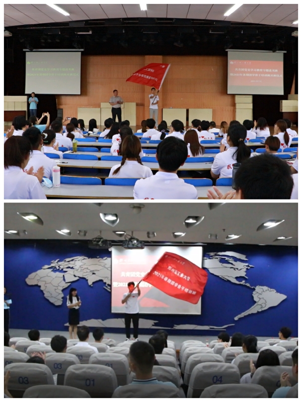 此次培训班是在学校共青团全面加强“学党史、强信念、跟党走”学习教育、提升共青团“三力一度”的背景下举办的学习培训活动,旨在加强团学骨干理论学习,感悟“真理之甘甜”,自觉“知行合一”为群众办实事。计算机与通信工程学院王航航、电气信息工程学院贾连斐作为两校区学员代表发言,他们号召大家珍惜学习机会,遵守培训纪律,把本次培训班的所学所感所悟更好地运用到服务同学、服务学校中。最后,本次培训班班主任为学校共青团党史学习教育专题读书班暨2021年暑期团学骨干培训班授旗。