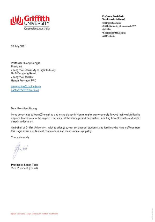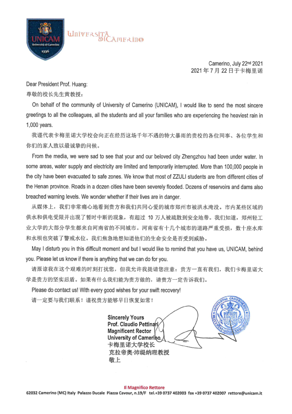 意大利卡梅里诺大学校长Claudio Pettinari来信对我省及我校内涝情况表示关切,向我校全体师生及家人致以问候。他表示卡梅里诺大学是我校坚实后盾,愿提供力所能及的帮助;澳大利亚格里菲斯大学副校长来信,对我校遭受的汛情表示同情,他希望来自格里菲斯大学的问候能给予我校师生员工必胜的信心;卡梅里诺大学高等研究院院长Roberto Ciccocioppo教授在来信中写道“卡梅里诺大学高等研究院以及卡梅里诺大学都心系贵校。我希望,我们之间的友谊能给你们带去动力,帮助贵校尽快从灾害中恢复。”此外荷兰方提斯应用技术大学、英国爱丁堡龙比亚大学、美国奥克兰大学、美国纽约州立布法罗学院、美国新墨西哥州立大学、澳大利亚格里菲斯大学、澳大利亚查尔斯达尔文大学、英国威尔士三一圣大卫大学、爱尔兰沃特福德理工学院等高校、国际友人和曾在我校任教的外籍教师均来电或通过其他方式询问情况,表达关切和慰问。