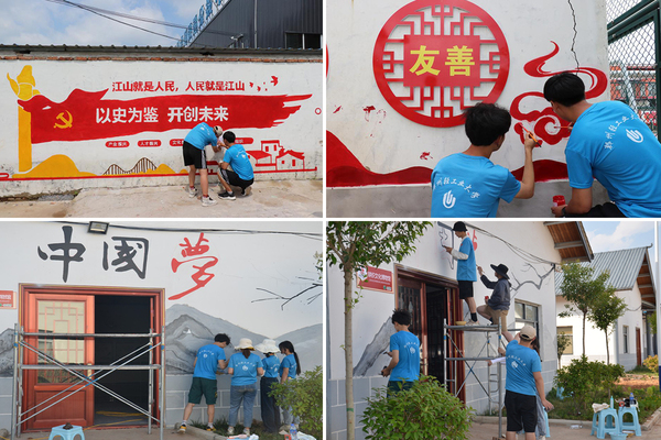 “艺路有你”乡村墙绘服务团在商水县西赵桥村等地开展了主题墙绘创作活动。志愿者们结合乡村振兴时代背景,根据习近平总书记在“七一勋章”颁授仪式和建党100周年庆祝大会上发表的讲话精神,精心设计了墙绘方案。绘制过程中,志愿者们精益求精,夜间忍受蚊虫叮咬,一丝不苟勾画轮廓,白天头顶烈日,一笔一划为墙体上色。经过志愿者的辛苦劳动,辛勤耕耘的老伯、任劳任怨的黄牛、织布纺纱的妇女等一个个生动人物和景象跃然于墙上,不仅彰显了农村耕织文化的深厚底蕴,更展现了同学们助力乡村振兴的一片赤诚之心,成为乡村一道靓丽的风景线。