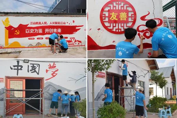 “艺路有你”乡村墙绘服务团在商水县西赵桥村等地开展了主题墙绘创作活动。志愿者们结合乡村振兴时代背景,根据习近平总书记在“七一勋章”颁授仪式和建党100周年庆祝大会上发表的讲话精神,精心设计了墙绘方案。绘制过程中,志愿者们精益求精,夜间忍受蚊虫叮咬,一丝不苟勾画轮廓,白天头顶烈日,一笔一划为墙体上色。经过志愿者的辛苦劳动,辛勤耕耘的老伯、任劳任怨的黄牛、织布纺纱的妇女等一个个生动人物和景象跃然于墙上,不仅彰显了农村耕织文化的深厚底蕴,更展现了同学们助力乡村振兴的一片赤诚之心,成为乡村一道靓丽的风景线。