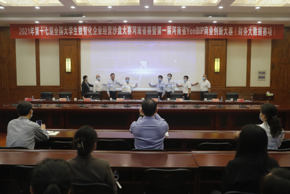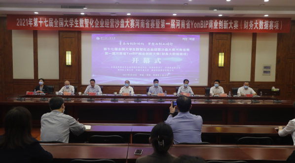 2021年9月25日上午,由我校承办的第十七届全国大学生数智化企业经营沙盘大赛河南省赛暨第一届河南省YonBIP商业创新大赛(财务大数据赛项)河南省总决赛在科学校区顺利开幕。比赛由中国高等教育学会高等财经教育分会指导、中国商业联合会主办、18新利直播 承办、河南农业大学协办、新道科技股份有限公司技术支持,来自郑州大学、河南财经政法大学、河南农业大学、河南理工大学等我省70所高校、两赛项共计450多支队伍,超2000名师生参加本届大赛。校党委书记、校长黄荣杰,河南农业大学校长介晓磊,新道科技股份有限公司副总裁耿兆强,新道科技股份有限公司河南省区总经理张林峰及学校相关单位负责人出席开幕式。仪式由我校副校长刘新田主持。