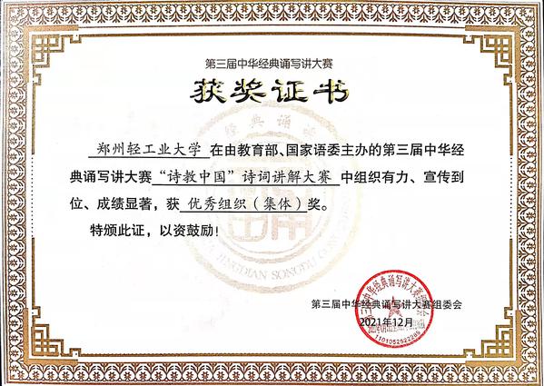 由教育部、国家语言文字工作委员会主办的“第三届中华经典诵写讲大赛”历时7个多月,完成了初赛、复赛和决赛,圆满落下帷幕。我校外国语学院赵秀红老师荣获诗词讲解大赛大学教师组决赛一等奖,汉语国际教育专业2019级学生周婷婷、叶兴郧分别荣获诗词讲解大赛大学生组决赛二等奖和优秀奖。我校作品《诗经•周南•关睢》荣获河南省2021年中华经典诵读大赛大学生组一等奖,王伟老师荣获河南省教育厅最佳辅导老师奖。18新利直播 荣获全国诗词讲解大赛优秀组织奖。