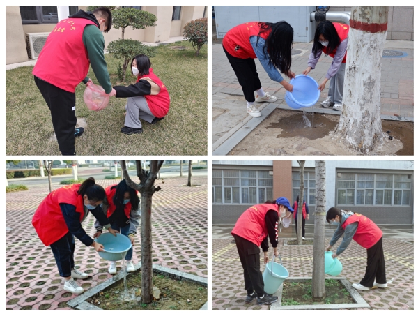 食品与生物工程学院、青年志愿者协会组织广大团员青年拿着铁锹、水盆等工具,对学校树木进行浇灌。大家首先对绿地进行整理,清除杂草和垃圾,对于无法打扫的断枝树叶,大家用手一一捡起,随后分小组浇灌树木,每一位青年学生通过亲身参与护绿活动,用实际行动践行绿色梦想,引领“爱绿风尚”。