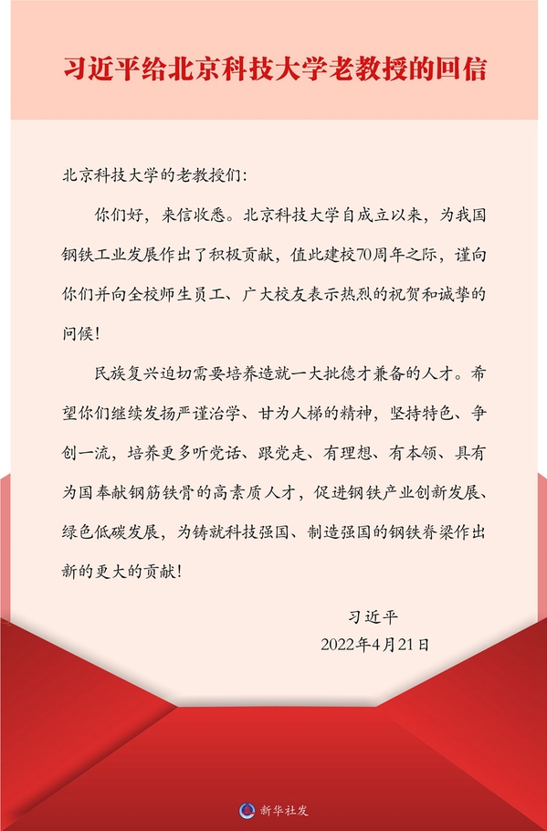 习近平在回信中说,北京科技大学自成立以来,为我国钢铁工业发展作出了积极贡献,值此建校70周年之际,谨向你们并向全校师生员工、广大校友表示热烈的祝贺和诚挚的问候!