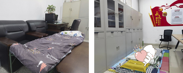 为了开展工作方便,老师们索性将“家”和“床”安在了办公室,用乐观的心态面对生活上暂时的困难。