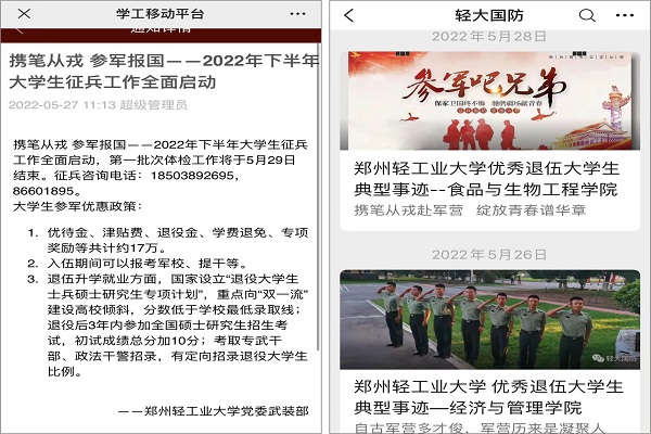 2020年起,大学生征兵工作实行“一年两征两退”,学校积极探索多维度、常态化征兵宣传机制,面向不同学生开展分级分类宣传发动。面向毕业生群体,重点开展“毕业就当兵,当兵即就业”的就业理念,引导广大毕业生投身军营建功立业;面向低年级学生,重点宣传考研升学、经济补助、复学优惠等参军入伍政策,帮助他们算好“前途帐”“经济账”;针对有军人情结、军旅情怀的大学生,帮助他们做好在部队成长发展的职业规划,宣传好、阐释好在部队报考军校、报送入学、直接提干、选改士官等方面的条件要求和政策优势。