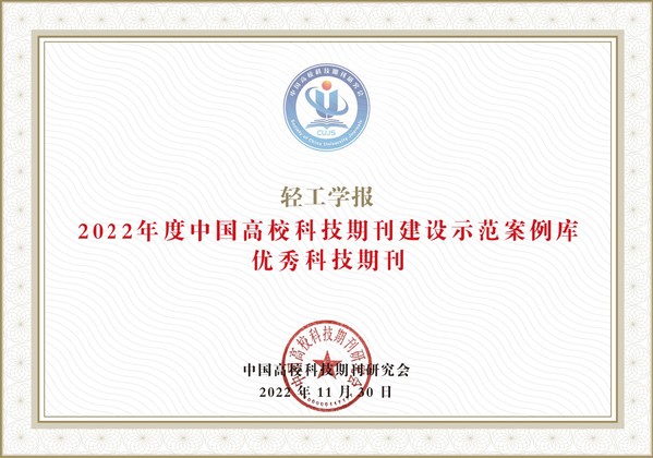 近日,中国高校科技期刊研究会公布了“2022年度中国高校科技期刊建设示范案例库•杰出/百佳/优秀科技期刊”遴选结果,《轻工学报》入选“2022年度中国高校优秀科技期刊”。