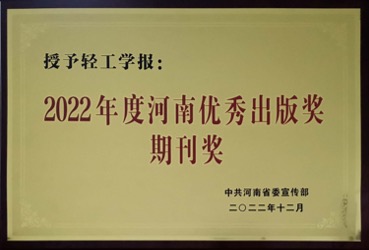为深入学习宣传贯彻习近平新时代中国特色社会主义思想,全面落实党的二十大精神,促进我省出版业繁荣发展,推进文化强省建设,中共河南省委宣传部组织开展了2022年度河南优秀出版奖评选表彰活动。经严格评选,《轻工学报》荣获“2022年度河南优秀出版奖·期刊奖”。