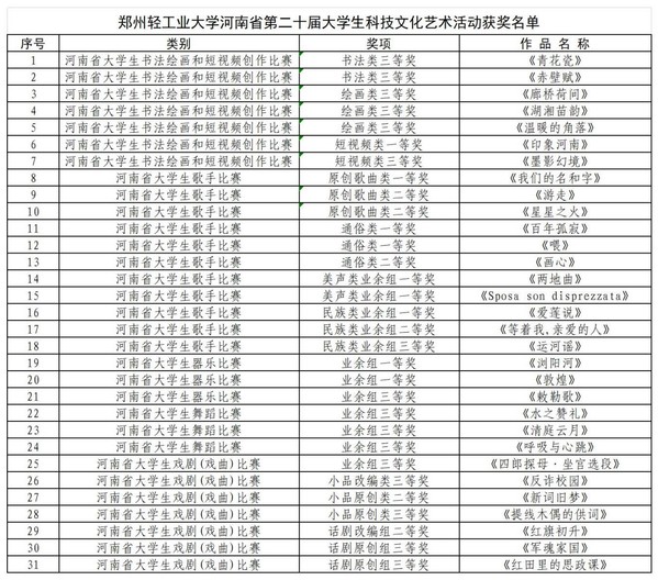 近日,由中共河南省委宣传部、共青团河南省委、河南省教育厅、河南省文化和旅游厅、河南省科学技术厅、河南省体育局、河南省学生联合会联合举办的河南省第二十届大学生科技文化艺术活动评选结果揭晓。我校荣获31个奖项,包括一等奖9项、二等奖6项、三等奖16项。