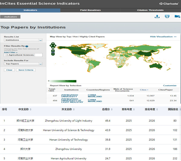 学科布局不断优化,国际影响力显著增强。食品安全与健康交叉学科、轻工技术与工程入选新一轮河南省重点学科,新增食品与营养专业学位授权点,育人体系更加完善。农业科学稳居ESI全球前3.5‰,U.S. News 2025-2026世界大学学科排名中,食品学科跃升至全球第80位,位次提升近百位,正加速成长为具有区域引领力、国内影响力的高水平优势学科。