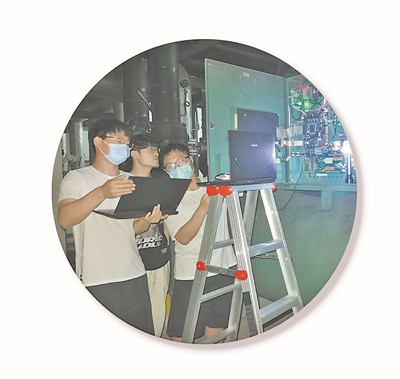 图① 高端装备实验室数字孪生课题负责人王昊琪(左一)进行实验研究。