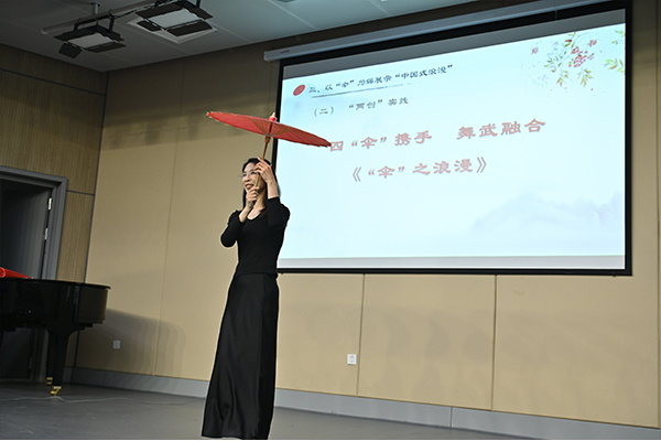课上,同学们一起学习了历史悠久的“伞文化”,了解了“伞”的古老“身世”及其中蕴含的浓浓诗意、英雄气概和深深情意,并与“四伞”携手,将“舞”与“武”融合,通过进行中华优秀传统文化“两创”实践展现“中国式浪漫”的独有意蕴。同学们跟随着刘老师一起了解油纸伞的历史及构造,练习太极伞的部分招式,体验傣族伞舞的独特步法,学习瑶族伞舞的由来和转伞之技,并将学习和体验的招式、动作和技巧融合创造,展现“伞”的诗意、美感和义气,感悟“伞”的美好精神品质,领悟如何做一个温暖而有力量的人。