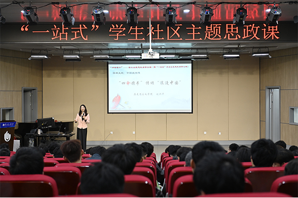 2025年10月16日下午,“问古颂今”轻大主题思政课“中国式浪漫”主题第一期暨“一站式”学生社区思政课第七期于科学校区音乐厅开讲。校党委宣传部、党委学工部、马克思主义学院、新时代思想政治教育研究中心等部门的相关领导和老师,以及“一站式”学生社区200名学生及辅导员参与。马克思主义学院刘兴华老师担任主讲,题目为《“四伞携手”传颂“浪漫中国”》。
