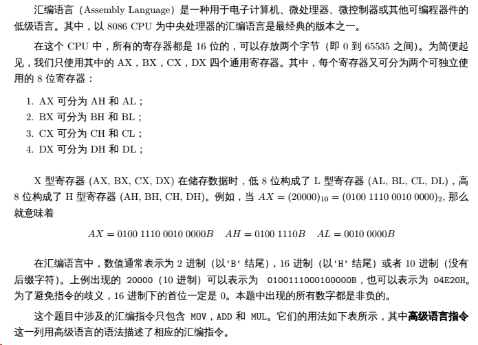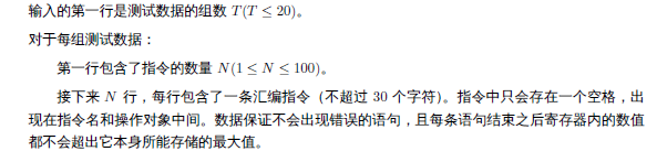 注意在 MOV 和 ADD 操作中,指令的两个操作对象的位数应当是一致的,即不会出现如 MOV AX,BL或 ADD AL,0100H 这样错误的指令。在初始状态下,四个通用寄存器中的数值均为 0。给定一系列的汇编指令,请输出按顺序执行完所有指令后四个通用寄存器中的数值。