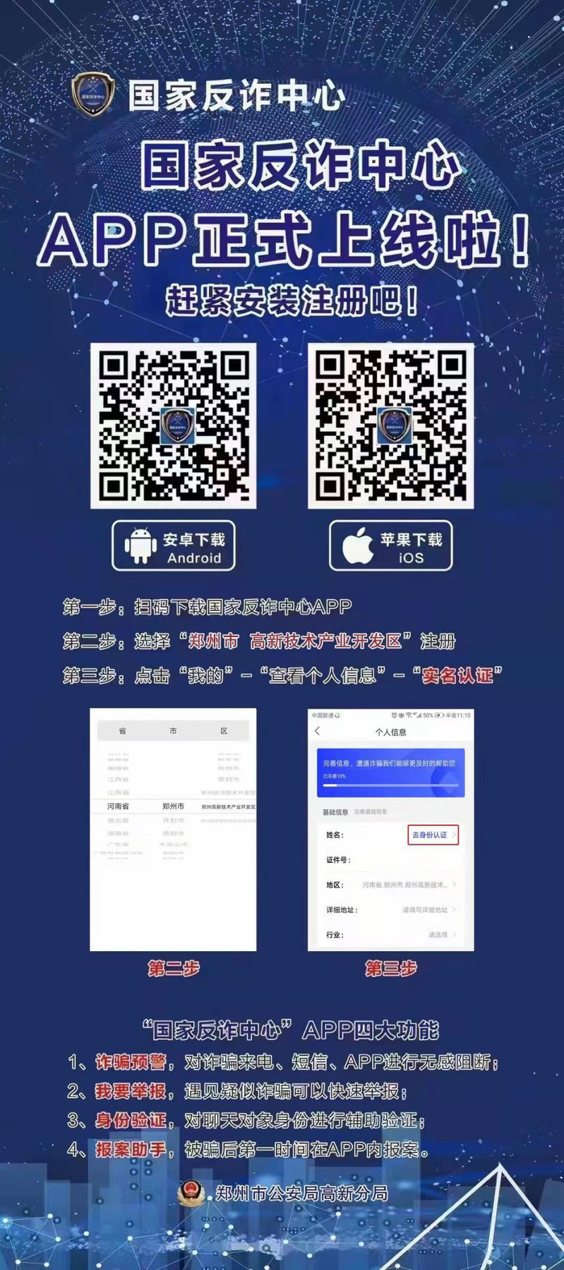 根据属地派出所通知,“国家反诈中心”正式上线,这是国家层面推出的官方APP。安装注册后,手机收到诈骗电话或短信,将会自动提示,可有效防范电信诈骗,守护“钱袋子”安全。请大家扫码下载注册。