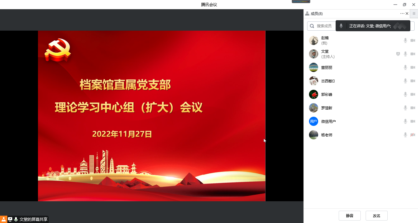 11月27日下午,为持续深入学习党的二十大精神,档案馆直属党支部在线召开了理论学习中心组(扩大)学习会。