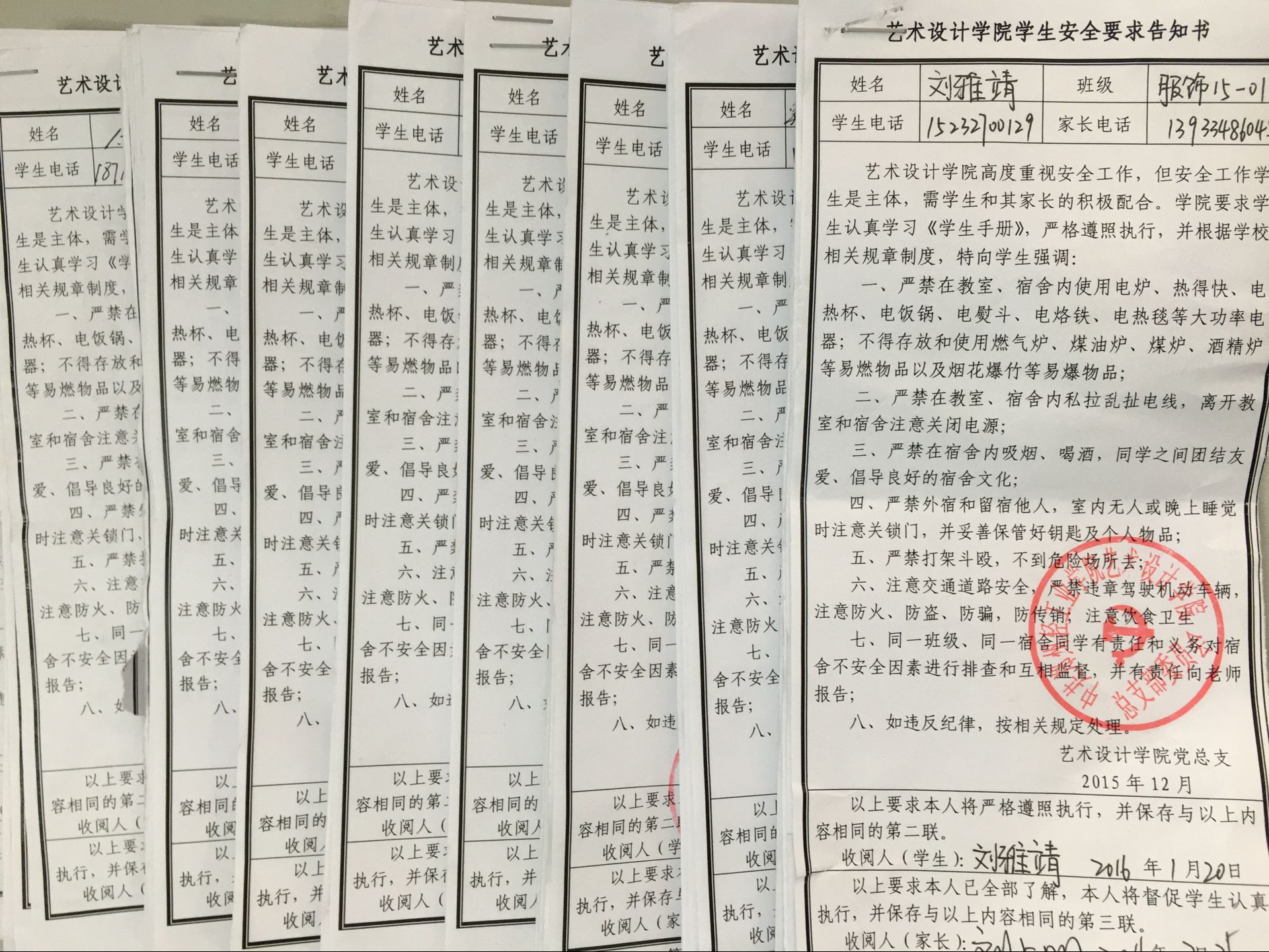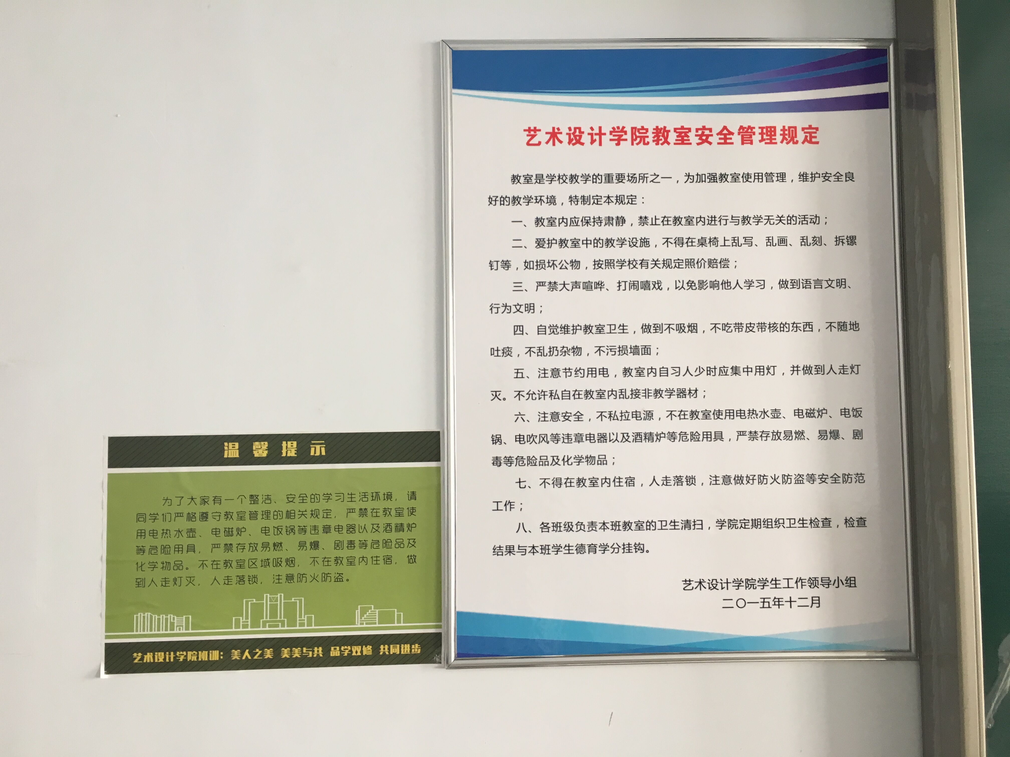 教室和宿舍是学生日常学习生活的主要场所,为保障学生学习生活环境的安全、文明、卫生,学院在79个专业教室张贴《艺术设计学院教室安全管理规定》及教室安全《温馨提示》,在320多个宿舍张贴宿舍安全《温馨提示》,制定了艺术设计学院班训和舍训,与各班班长签订了《教室管理责任书》;为取得学生家长对学校安全教育的支持和配合,共同做好安全教育工作,学院每学年与学生及学生家长签订一次《安全告知书》,学院、学生、学生家长各留存一份,强化安全第一,预防为主的安全防范意识,携手共建和谐校园。