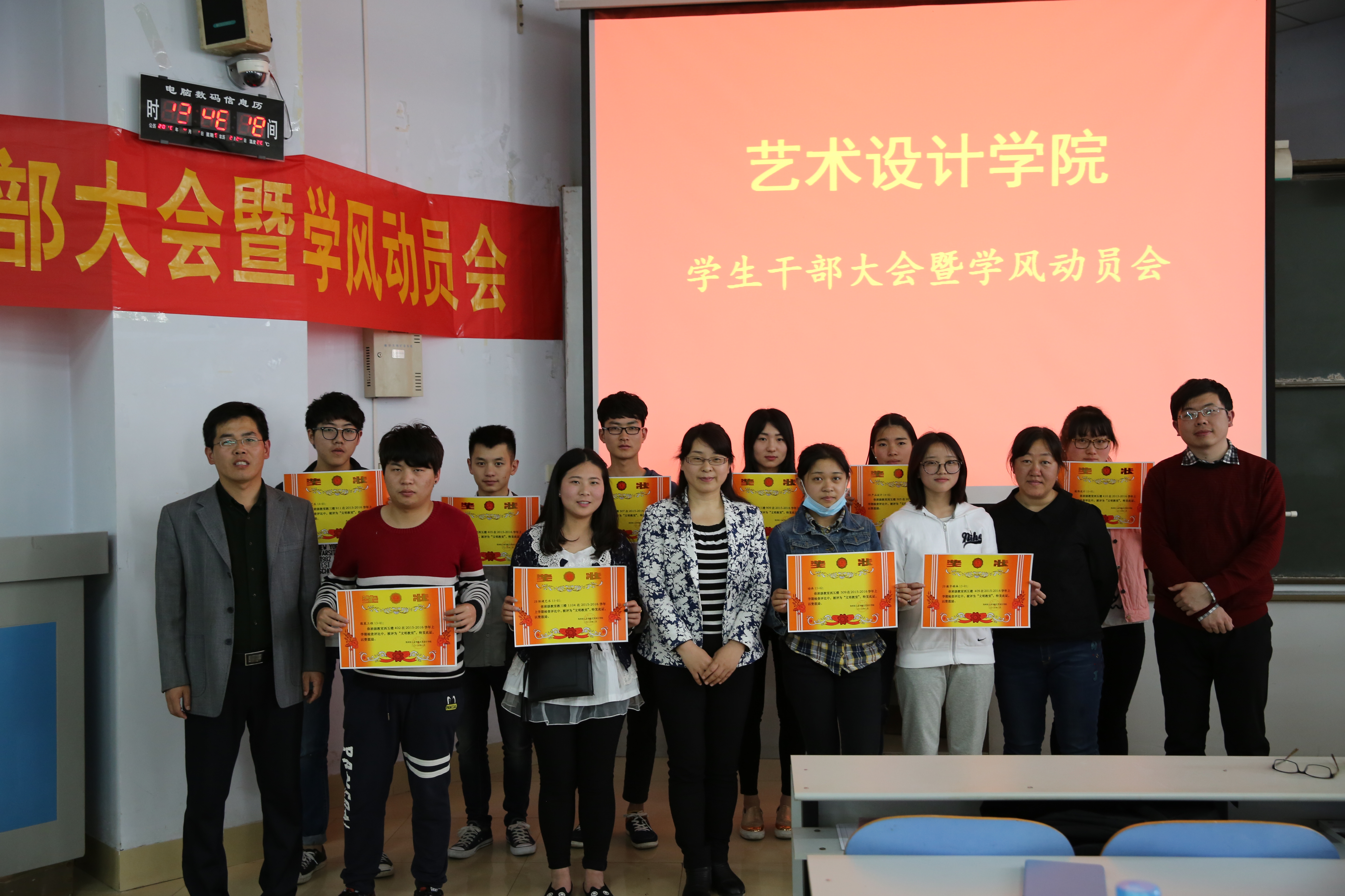 大会发布了学院新修订的《艺术设计学院德育学分评定细则》与《艺术设计学院困难生认定细则》,任红印老师和霍庆媛老师分别就两项新规定的关键条款向全体学生干部进行了细致解析;孙丰老师根据学校学风建设要求,对学院具体开展的活动执行安排进行了部署。大会还对文明宿舍、优秀学生干部以及寒假社会实践优秀个人进行了表彰。