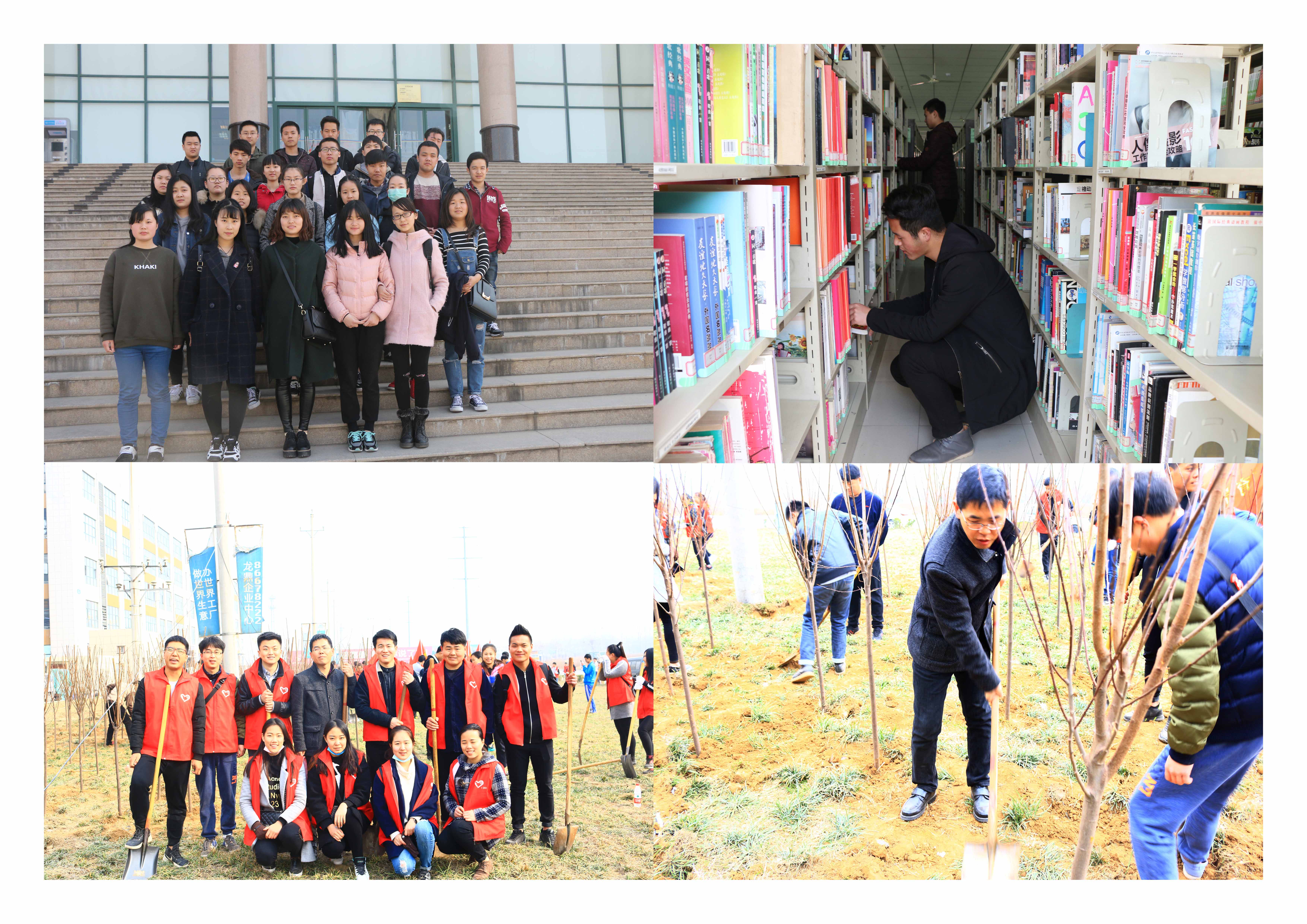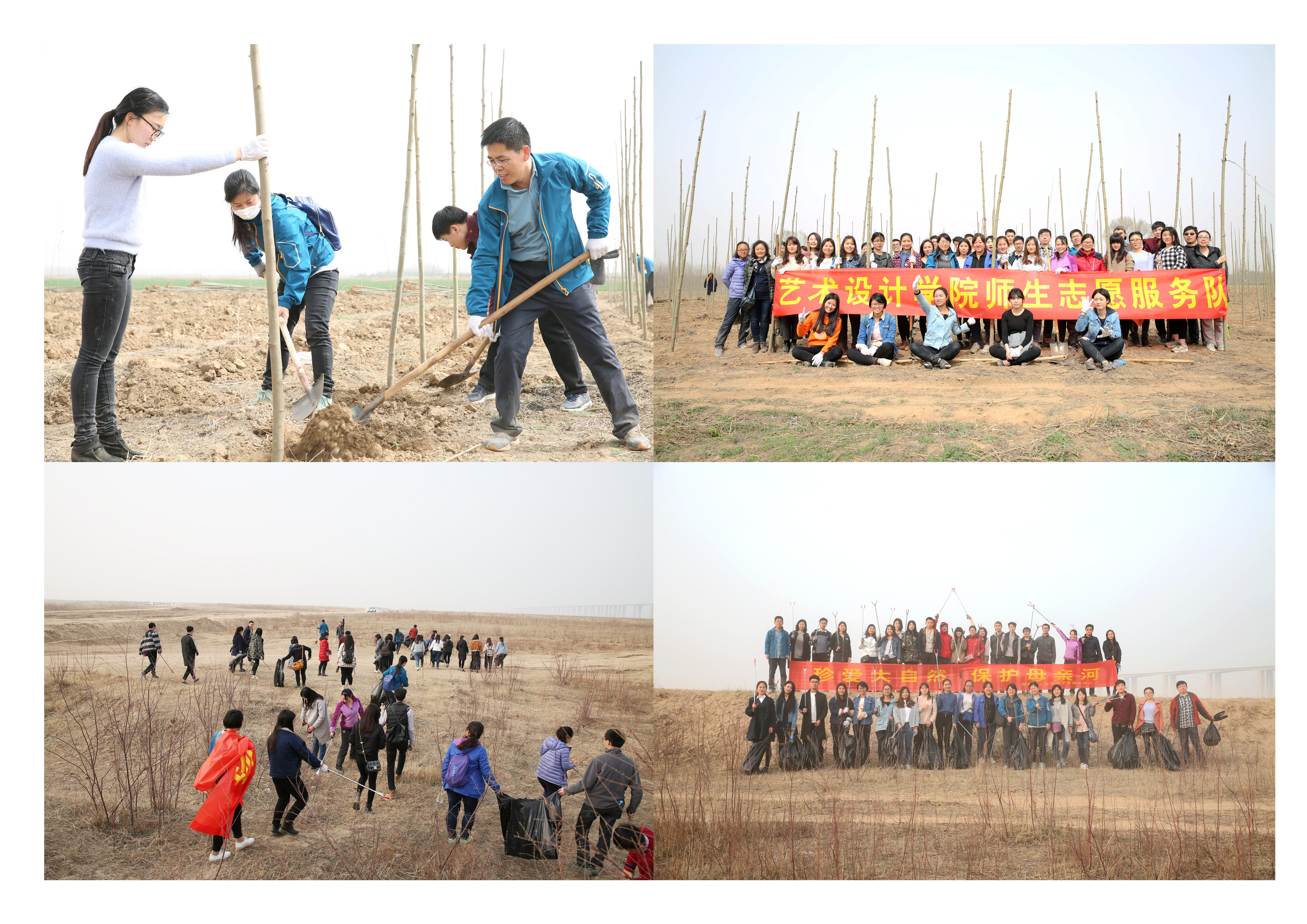 活动一:3月5日上午,艺术设计学院分团委书记任红印老师组织带领22名大学生志愿者参加学院在荥阳市王村镇开展的义务植树活动。整个植树现场呈现出一片热火朝天的劳动景象。大家个个热情高涨、干劲十足,配合默契,每道工序有条不紊,一丝不苟,一直持续到中午1点。虽然全身是土,饥肠辘辘,但看到成排的法桐迎着和煦春风昂然挺立,大家都欣慰的笑了。
