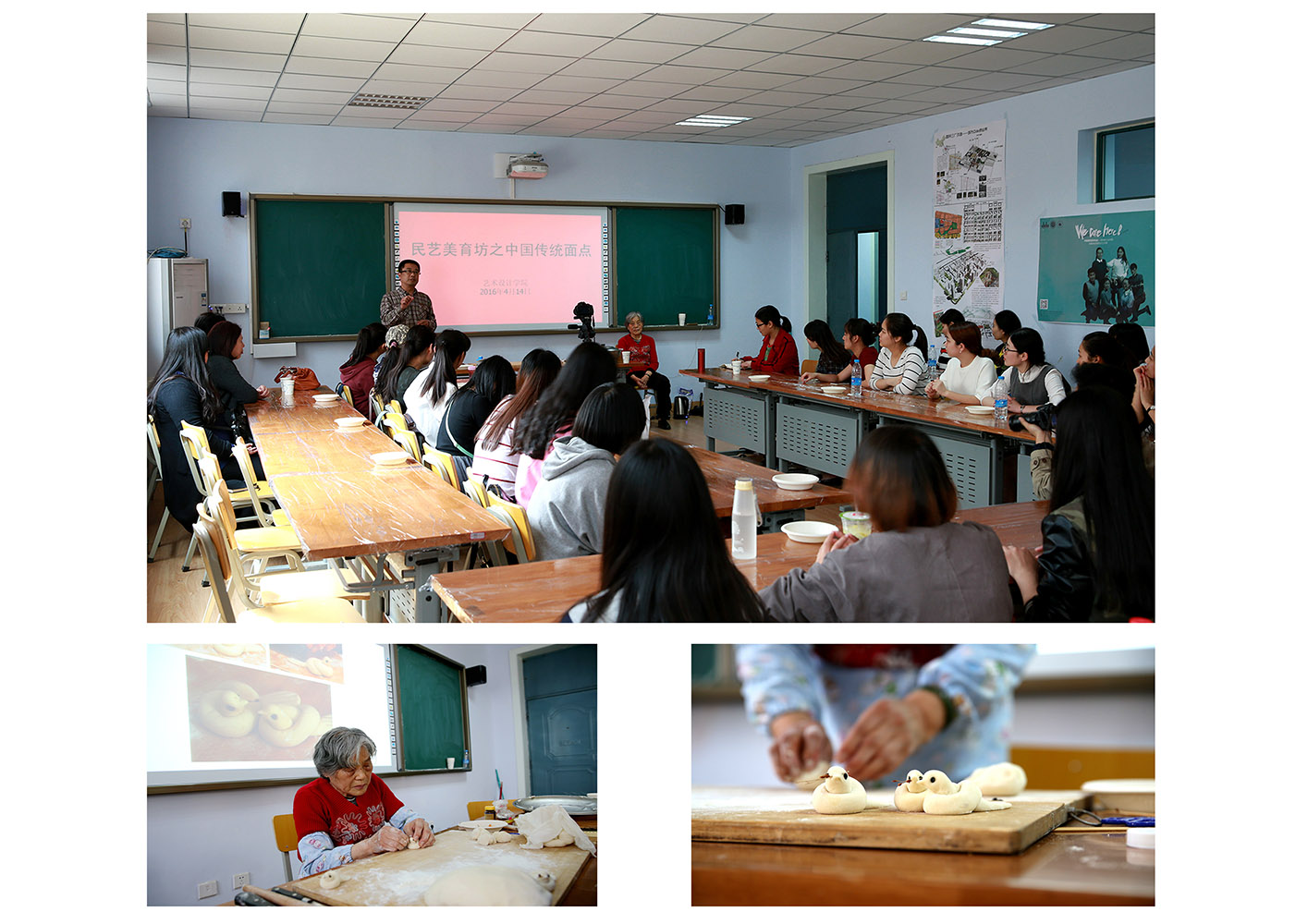 2016年4月14日下午,艺术设计学院民艺美育坊之中国传统面点活动在东四楼207教室成功举行。学院特别邀请了河南省民间艺人、78岁的余金荣老人主讲。学院党总支书记邵元珠老师、副书记张莉老师及部分教师和本硕学生共计50余人参与了活动。