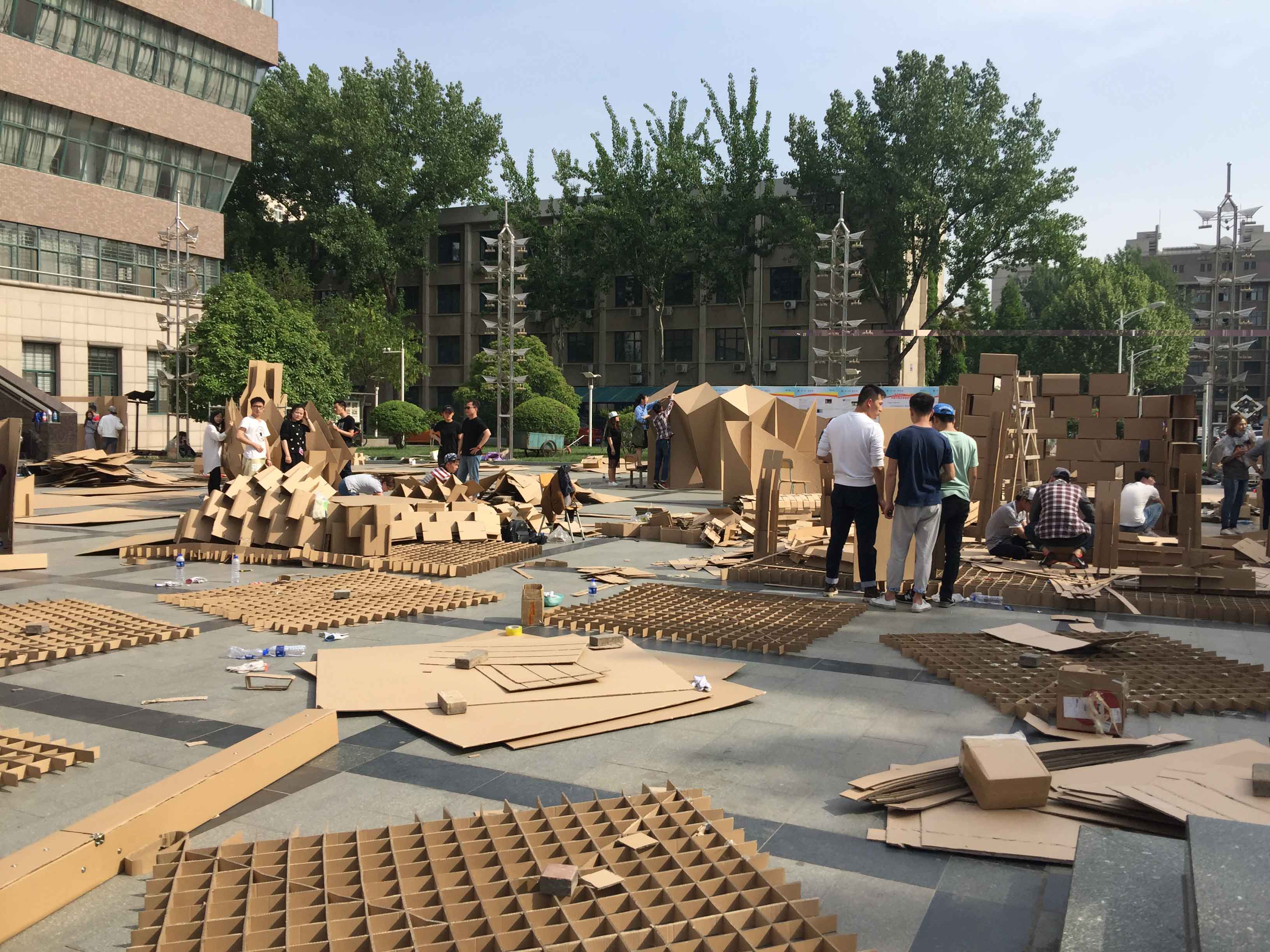 此后,同学们就开始了两周的设计训练。此次训练营活动,学生首次全程设计并最终展出了21组1:1大型室外模型,参与的每组同学都表现出了极强的设计创新意识。通过模型建造实践,使学生获得对材料性能、建造方式及过程的感性认知,并能够很好地把握使用功能、尺度及空间形态等方面的要求。上午8点开始,训练营评审委员会专家分别对各组的纸板建筑在结构、空间和形态等方面进行了细致、综合地考量,通过现场打分评出了本届生长空间的各类奖项。本次活动的又一亮点即颁奖仪式贯穿于学术讲座中,由环境设计系原系主任曹瑞林教授及刘世尧、王政强、郑雁冰等知名设计师为获奖作品作精彩点评,将学生们在实践环节的最终成果上升到设计理论、理念的高度,为设计类学生如何将所学知识运用到实践创新、创业之中提纲携领。