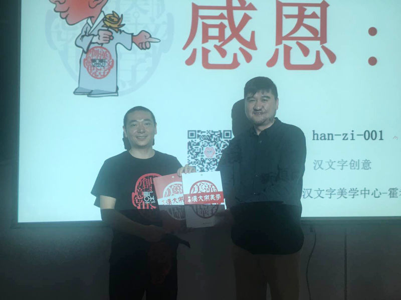 汉字美学研究者、设计师霍者与师生分享了汉字创意的奥妙,他强调,简化汉字过程中不能忘“根”。他认为,现在汉字等优秀传统文化遭到越来越多的人冷落、忽视、践踏,对此有必要进行反思。霍者先生针对汉字为我们进行了深入浅出的讲解,给大家上了一堂生动的趣谈汉字课,使同学们受益匪浅。霍者先生讲课生动有趣,诙谐幽默。讲座接近尾声时,霍者先生与同学们开展互动环节。他一一详细解答同学们提出的疑惑。讲座结束后霍者先生向我院图书室赠送自己编撰的汉字美学书籍,并纷纷与霍者先生合影留念。