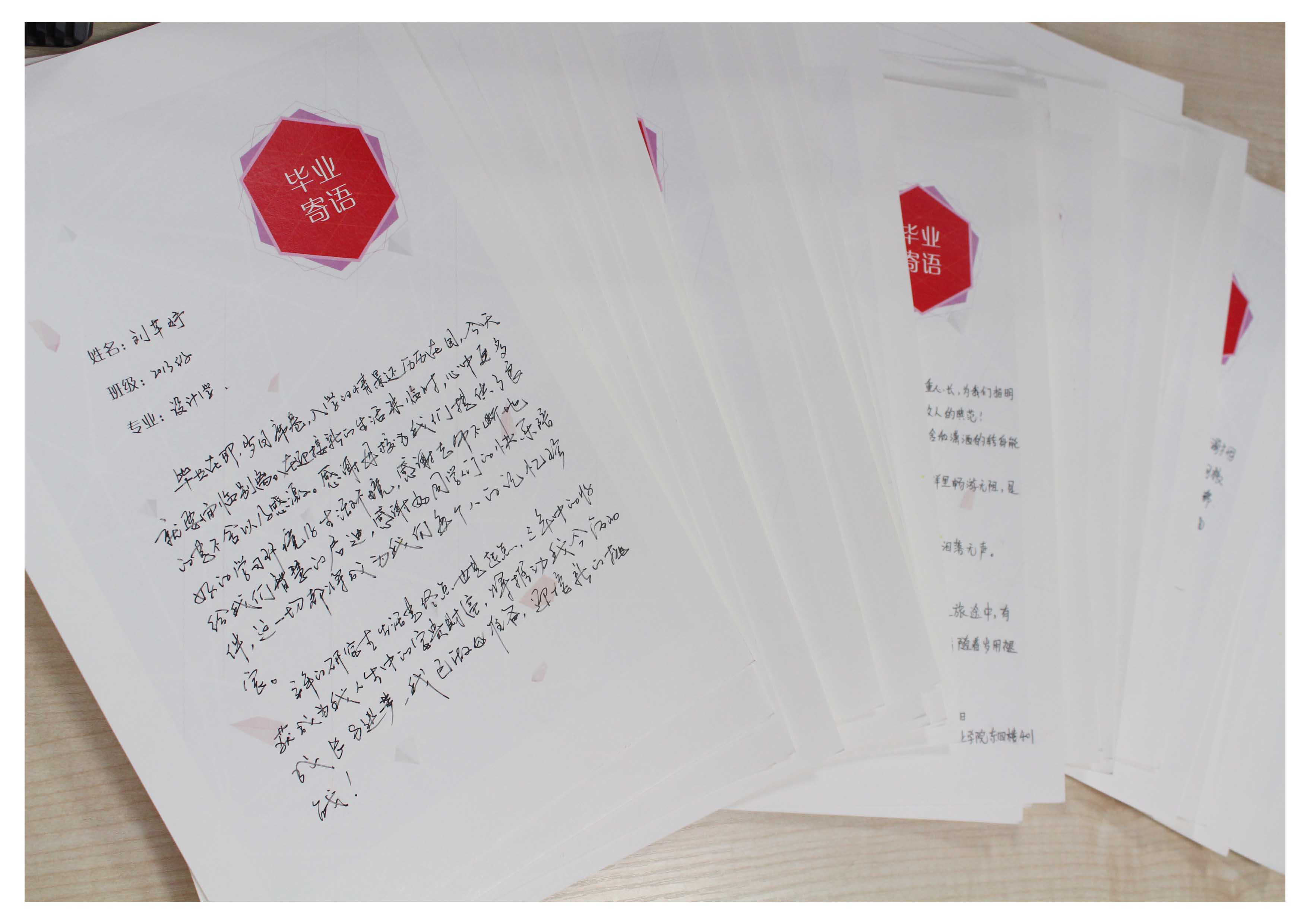 经过前期的宣传,关爱母校寄语活动得到了热情的响应。短短几天时间,毕业生纷纷在“毕业寄语”卡片上写满了自己真挚的感悟和祝福,字里行间流露着对母校的深深眷恋和感激之情。有的写下了个人在思想、学习和生活等方面的收获和感受,有的回忆了自己三年研究生生活的酸甜苦辣,有的抒发对母校的留恋与祝福、对导师的不舍与希冀、对三年同窗好友的深厚情谊等,在离别之际显得格外的弥足珍贵。离别不是结束,而是放飞梦想的一个新起点,同学们这样写到:“又到凤凰花朵开放的时候,时光的河入海流,终于我们分头走”,“相逢是问候,离别是祝福,再见了母校,到一声珍重,让青春在这里起航”。