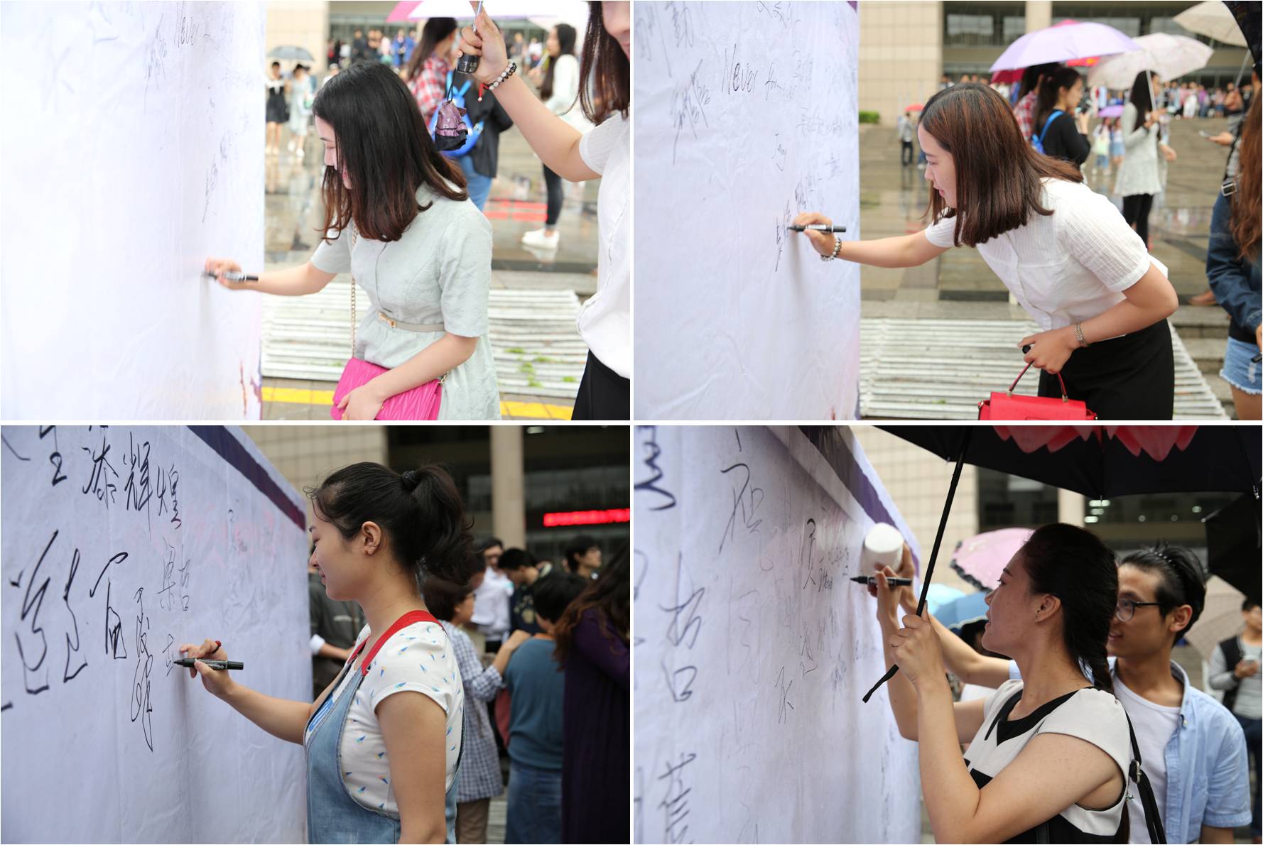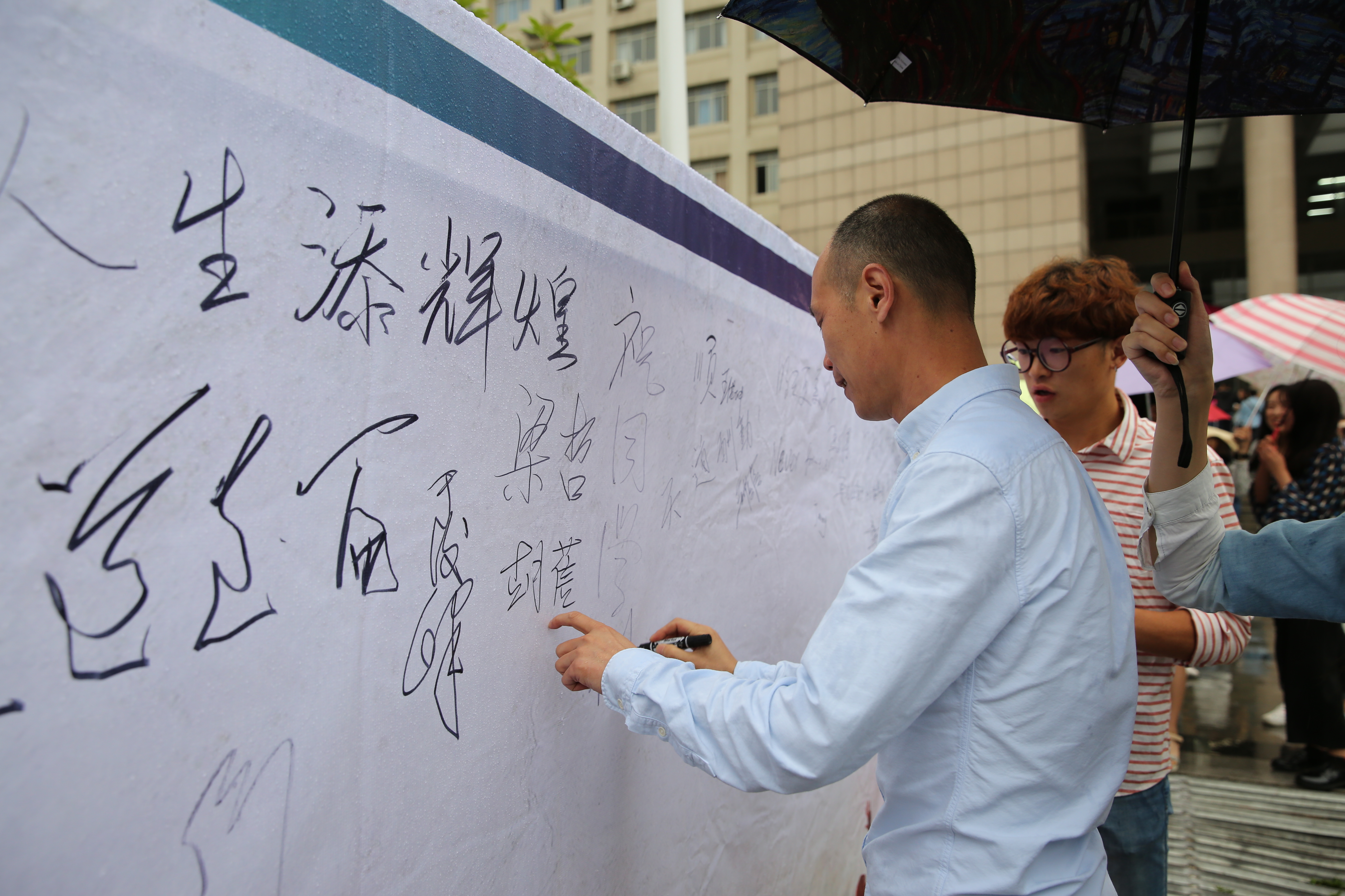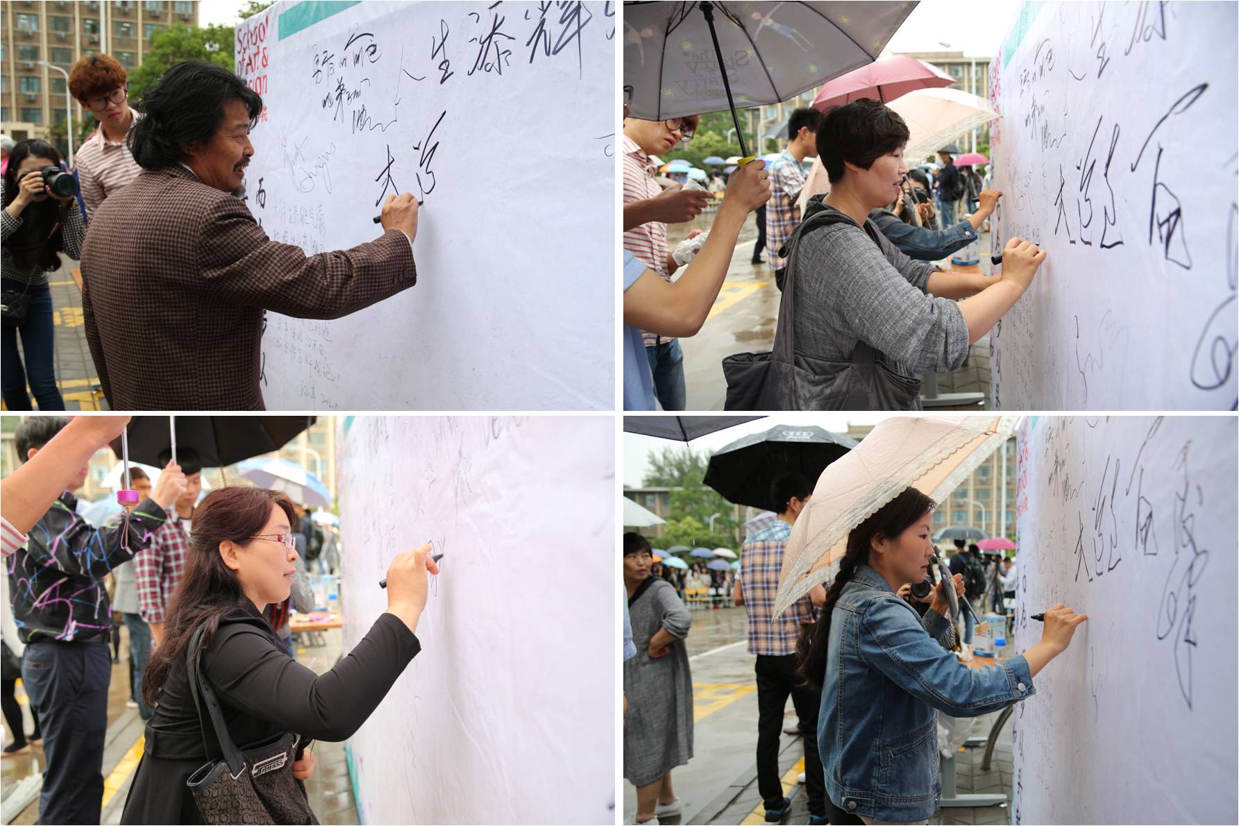 2016年5月28日早上,乌云翻滚,霪雨霏霏,天公不作美挡不住师生的饱满热情。艺术设计学院借毕业生合影之机,在东风校区教三楼门前广场开展签名寄语活动。院长曹阳教授、学院党总支书记邵元珠老师以及全体教职工和2015届毕业生参与了活动。