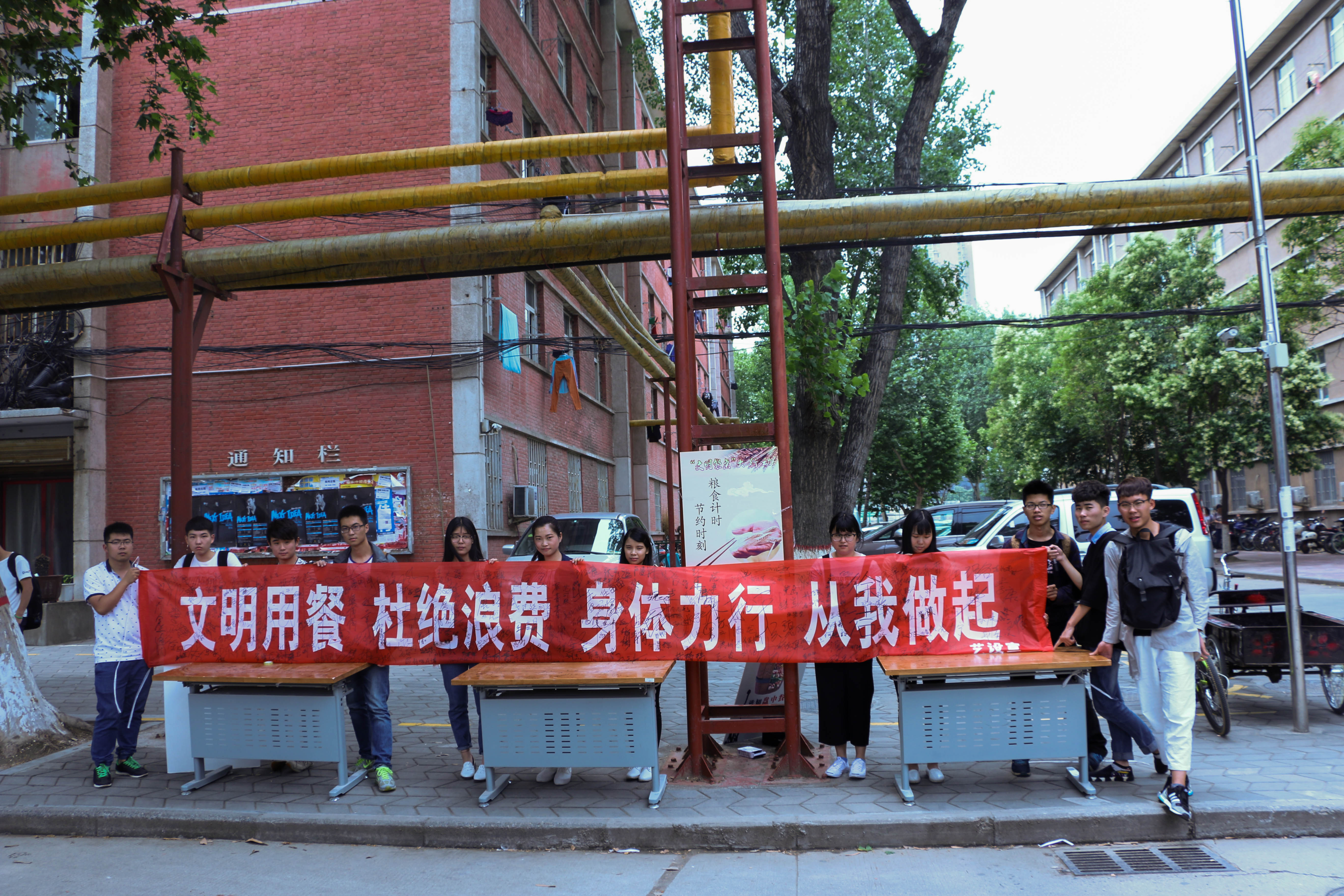 活动以“文明用餐,杜绝浪费,身体力行,从我做起”为主题,倡导同学们文明用餐。活动得到了广大同学们的积极响应,大家纷纷在条幅上签下自己的名字,团总支成员积极宣传文明用餐、杜绝浪费的理念,让大家理解“文明餐桌”活动的重要性。