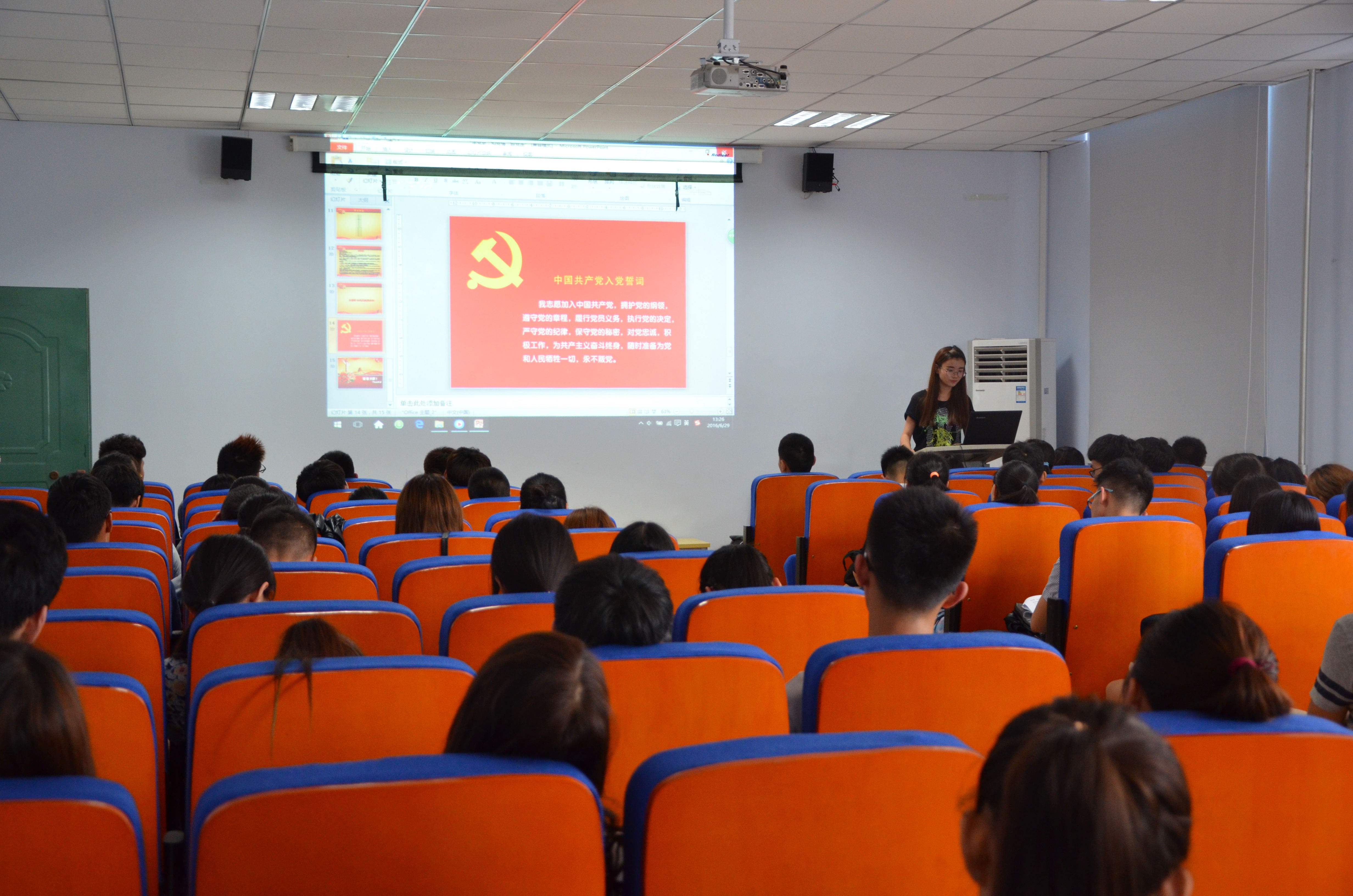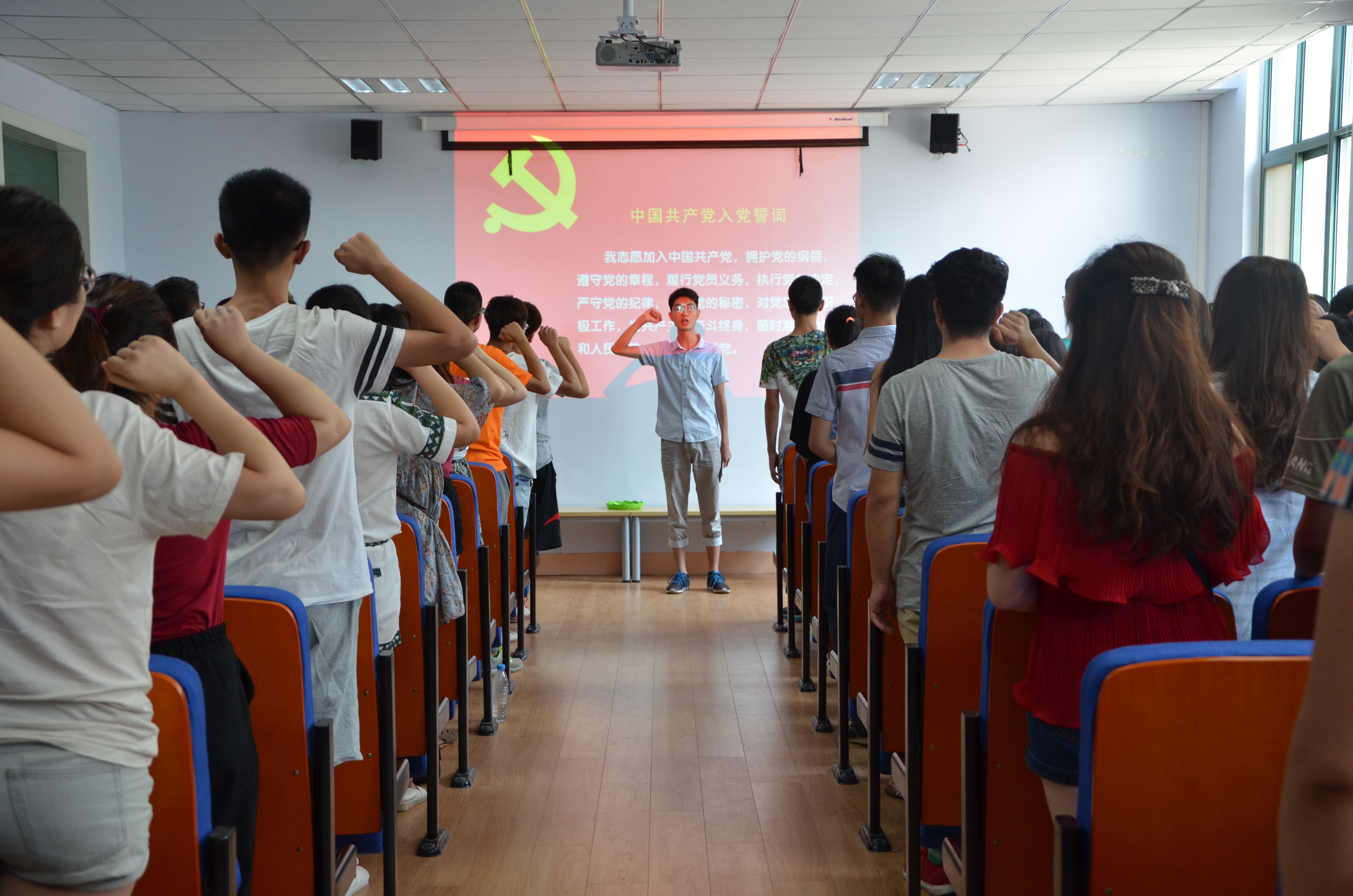活动中,学生代表的演讲和红色电影展播让大家重新回顾了中国共产党发展的光辉历史以及95年来涌现的英雄事迹。党史知识的现场提问互动环节让同学们结合自身对党的认识,阐述了自己心目中的中国共产党。活动最后,同学们重温了入党誓词,“为共产主义事业奋斗终生”的誓言回荡在教室中,也深深的刻在了每一位同学的心里。另外,本次活动还通过团总支的微博网络平台与全院同学进行线上互动,大家围绕活动主题表达自己对党组织的深厚感情,同时表达了对党95岁华诞的美好祝愿。
