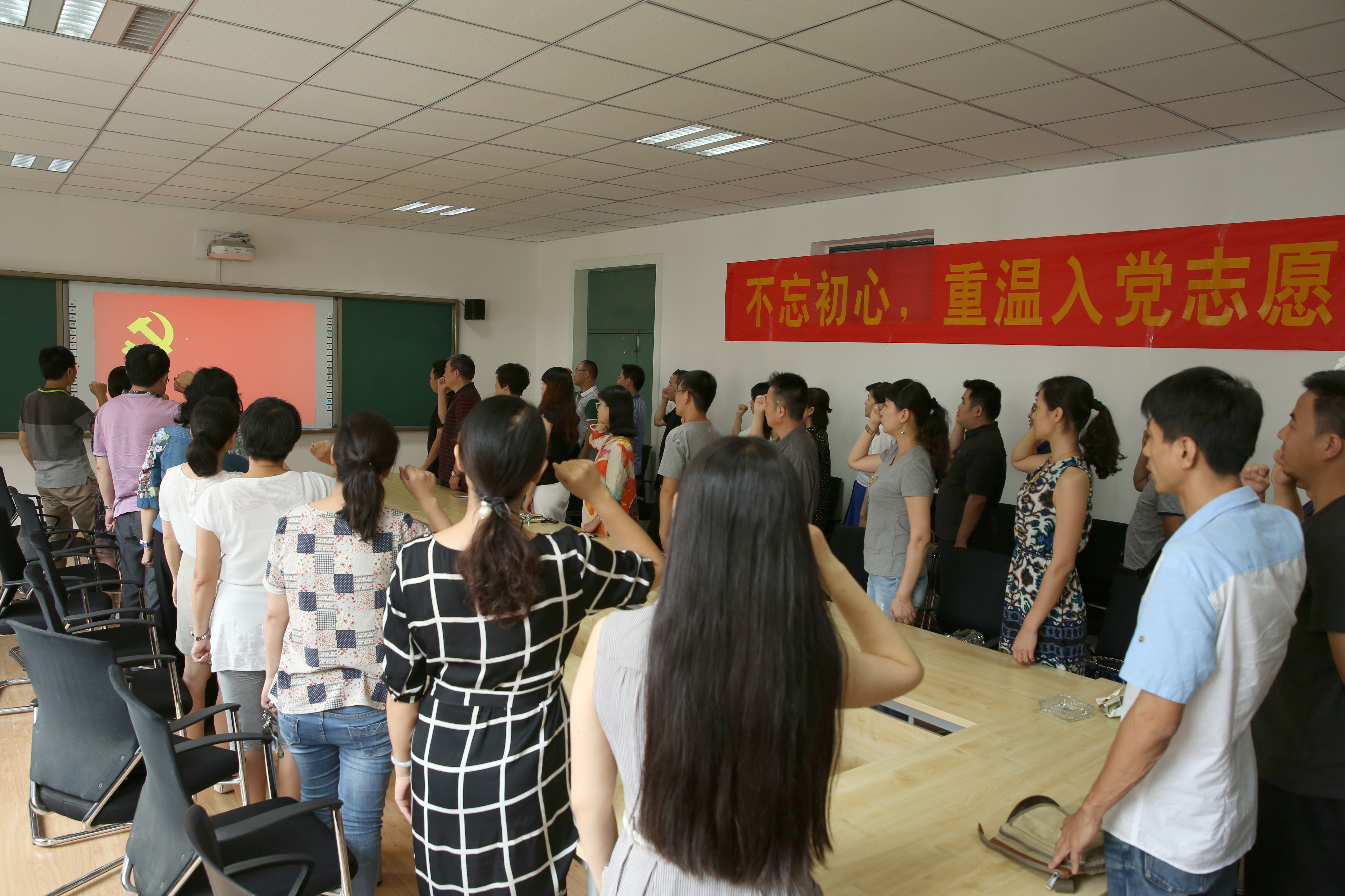 接下来,在邵书记的带领下,全体党员面对鲜红的党旗,举起右手,庄严宣誓,重温入党志愿。随后的座谈会上,每名党员回忆自己的成长历程、入党经历,并联系自身工作实际和个人成长经历总结了入党后的表现,以及“两学一做”活动开展以来的心得体会。