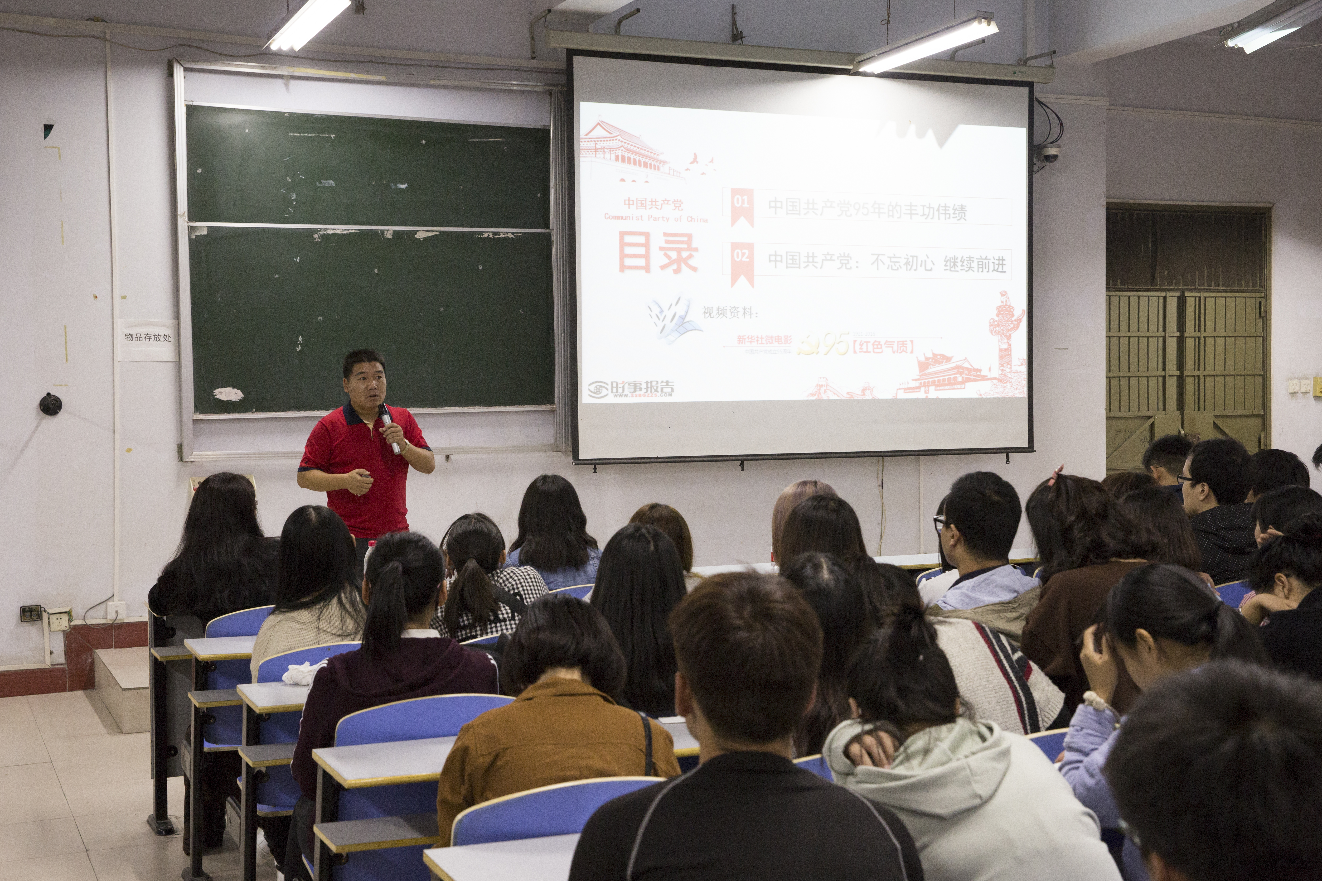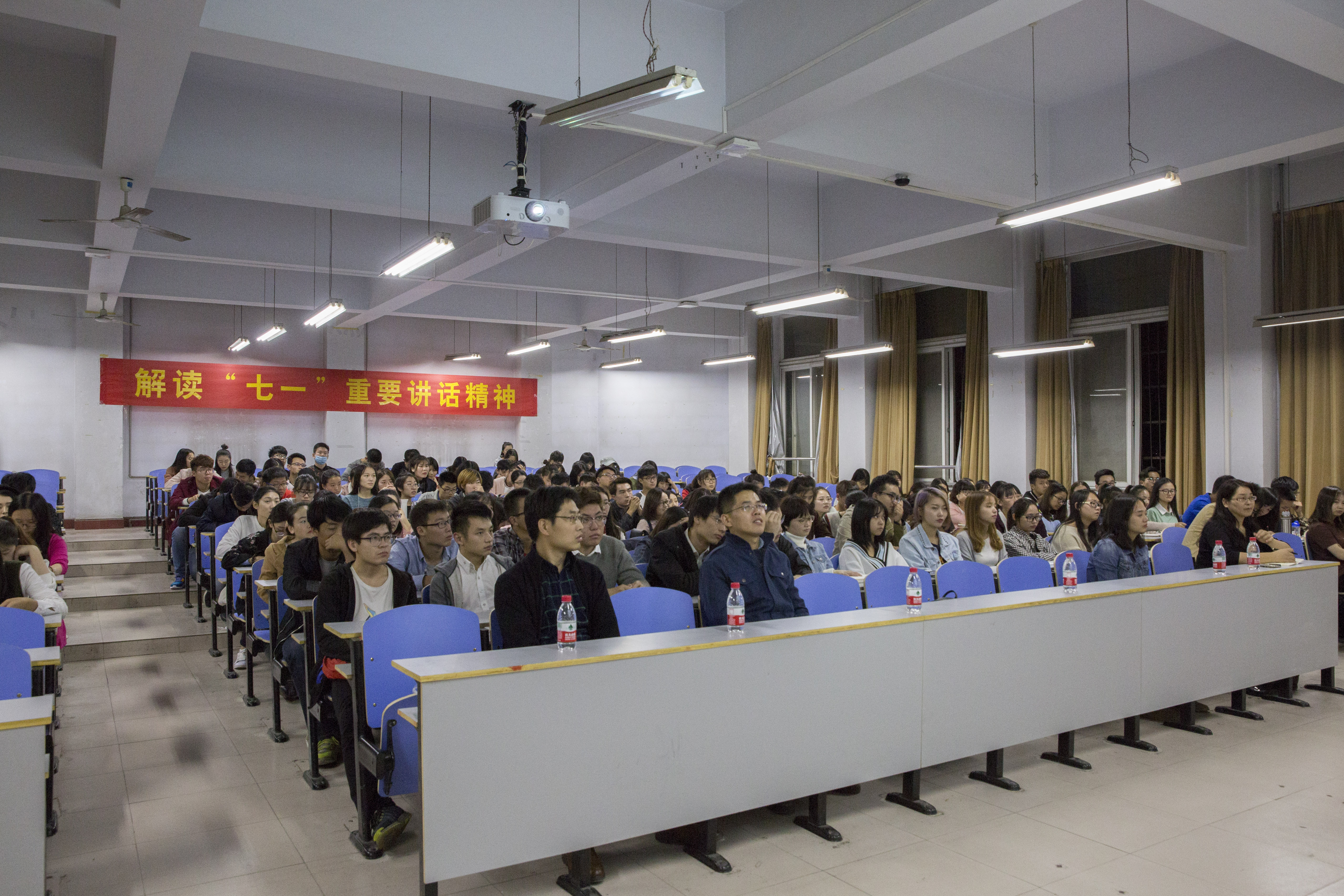 丁建波老师的讲座主要围绕中国共产党95年来的丰功伟绩和中国共产党不忘初心、继续前进两部分内容展开。丁老师首先就中国共产党成立后的三大成就:实现民族独立,建立新中国、确立基本制度,推进社会主义建设、进行改革开放,坚持和发展中国特色社会主义进行深入阐述,解读了中国共产党艰苦卓绝的历史和取得的丰功伟绩。接着,丁老师指出我们应牢记共产主义的理想信念,不能忘记走过的路、走过的过去、为什么出发,永远保持建党时中国共产党人的奋斗精神,永远保持对人民的赤子之心,始终不渝地走和平发展道路。丁老师鼓励大家要积极向前看,面向未来,面对挑战,一定要不忘初心、继续前进。讲座紧密结合师生思想学习实际,内容丰富、思路清晰、深入浅出、生动幽默,获得大家阵阵掌声和由衷的称赞。