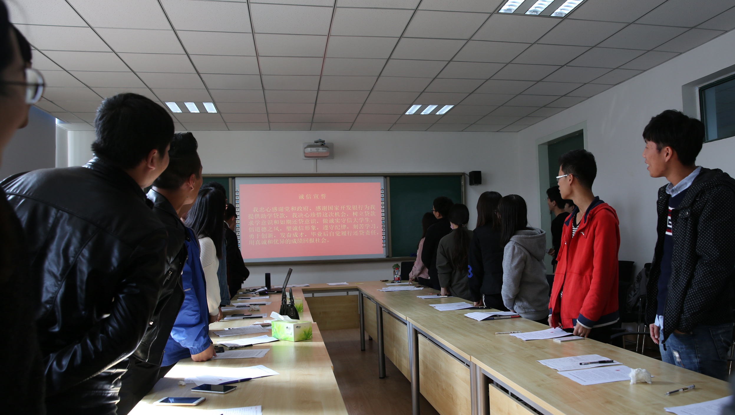 随后,负责贷款的老师组织全体学生签订了助学贷款合同,要求大家及时登录开行系统查看并核对个人信息。全体贷款学生进行了庄严的诚信宣誓,并表示要利用好国家助学贷款。最后,同学们一起观看了国家开发银行高校助学贷款和抵制“裸条”借贷的宣传片,希望同学们做好国家关于资助的政策的宣传,配合学校做好国家助学贷款方面的活动,珍惜这来之不易的机会。