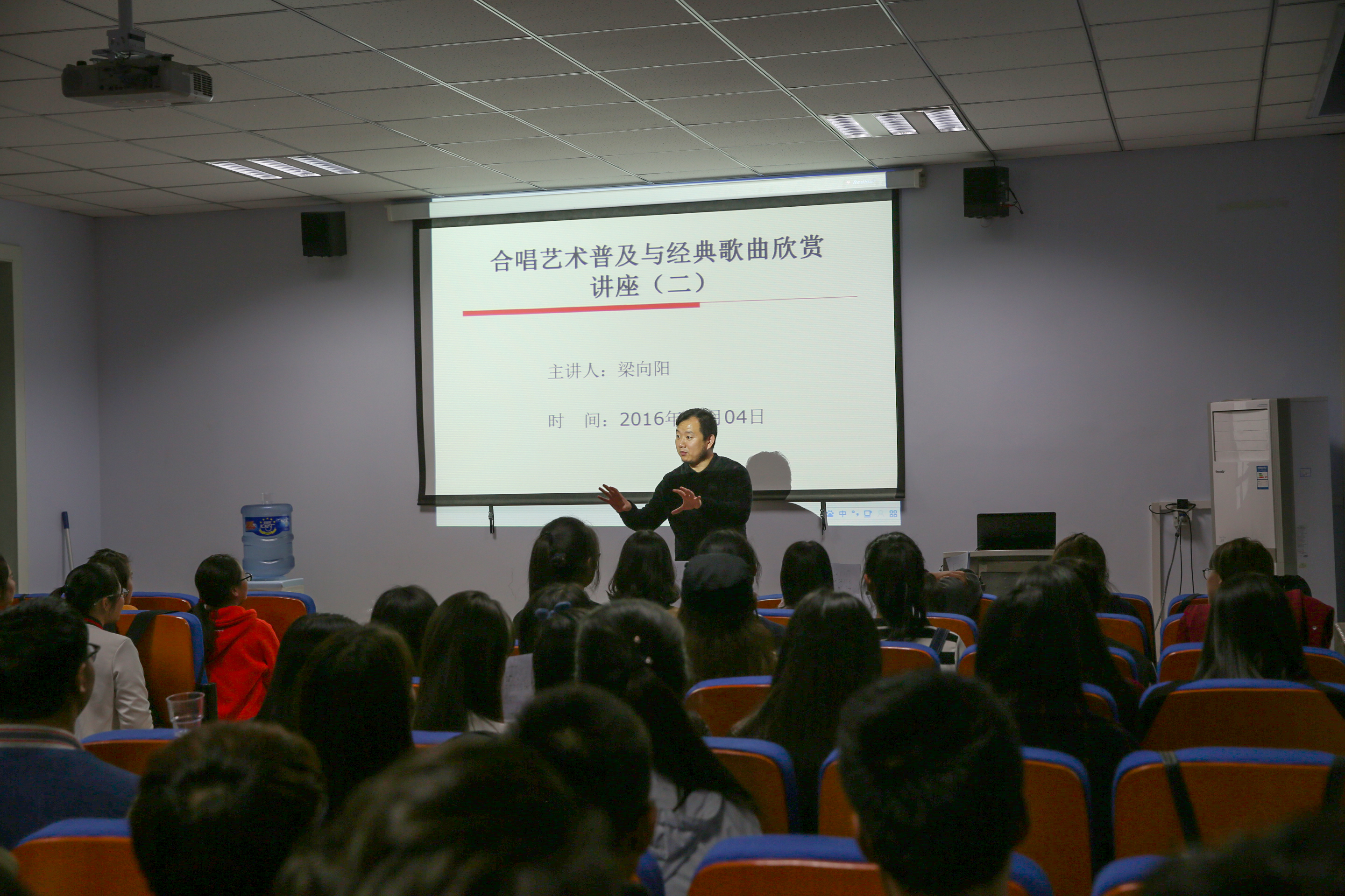 在讲座过程中,梁老师首先普及了合唱艺术的基本知识,随后从合唱的声音训练、合唱的音准训练、合唱各声部的均衡训练、合唱作品的音乐处理及合唱歌曲大家唱等五个方面逐一进行了讲解,最后,在欣赏经典歌曲前,梁老师着重阐述了合唱革命歌曲历史意义及作用,梁老师说,革命歌曲鼓舞了几代仁人志士人为祖国的解放、人民的富强抛头颅、洒热血作出应有的贡献,希望同学们唱好革命歌曲,把握美好时光,为国家的繁荣富强做出贡献。梁老师的讲解内容丰富,声情并茂,深入浅出,通俗易懂,幽默严肃,不时赢得在场一阵阵热烈的掌声。