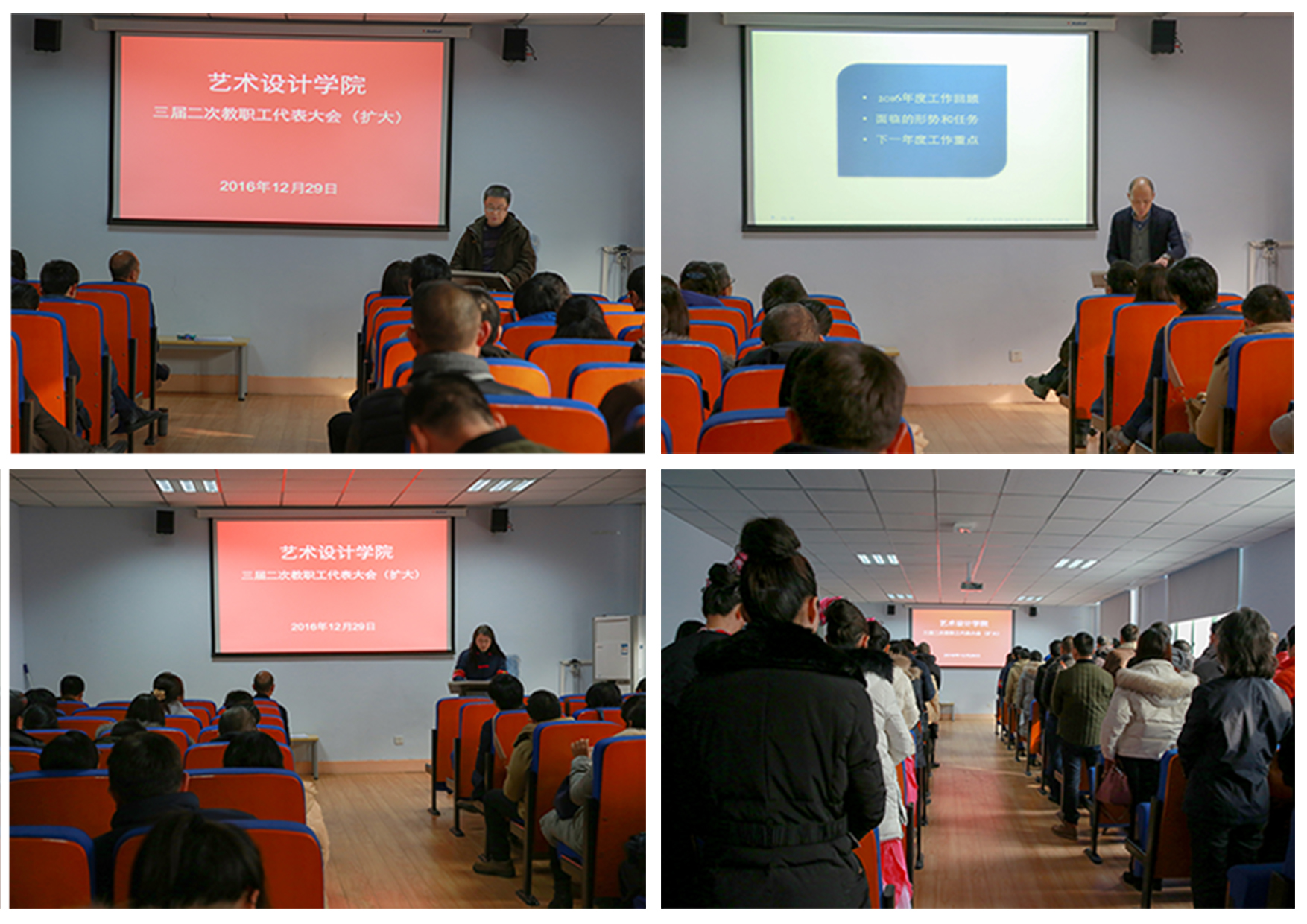 大会在雄壮的国歌声中拉开序幕。会上曹阳院长做《艺术设计学院2016年工作报告》、《艺术设计学院2016年财务工作报告》,向全体教职工报告了一年来学院人才与新利18 菲律宾 建设、教学质量提升、研究生培养管理、科研建设、学生管理、就业工作等方面所取得的成绩,以及学院财务工作等工作,并向教职工报告了2017年学院工作规划情况。
