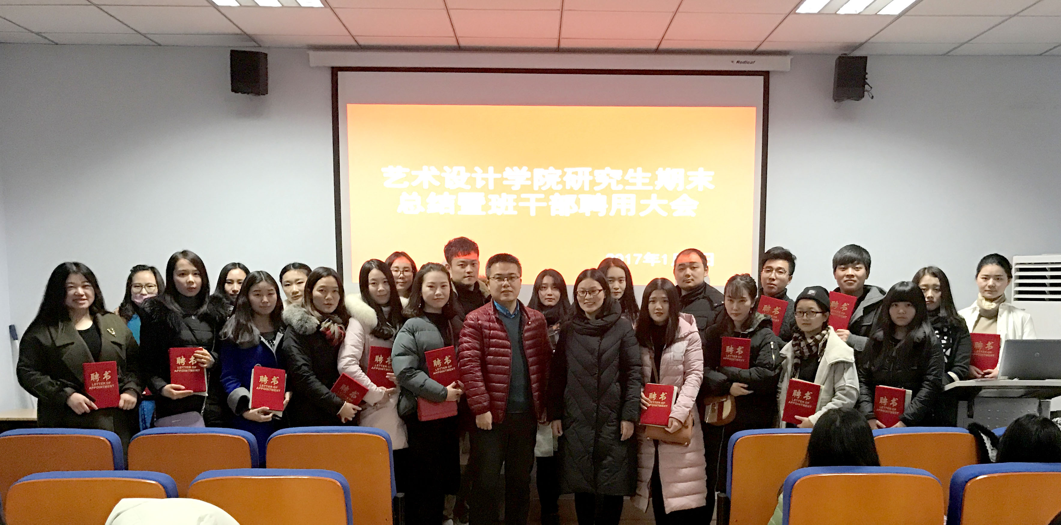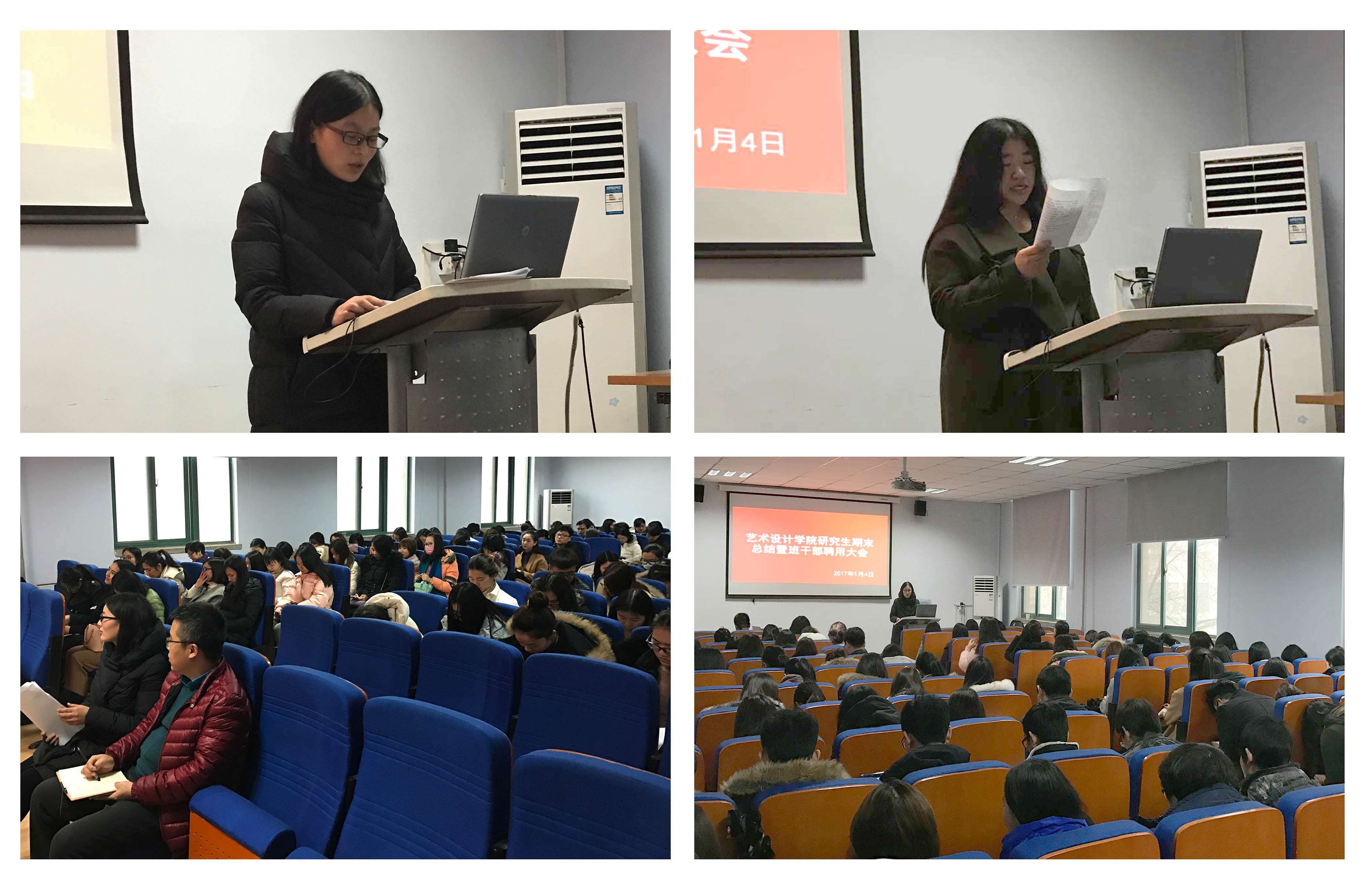 2017年1月4日下午,艺术设计学院研究生期末总结暨班干部聘用大会在东风校区东四楼301举行。研究生处吴晓宗老师、辅导员唐丹丹老师以及14级、15级、16级全体研究生参加了此次活动。