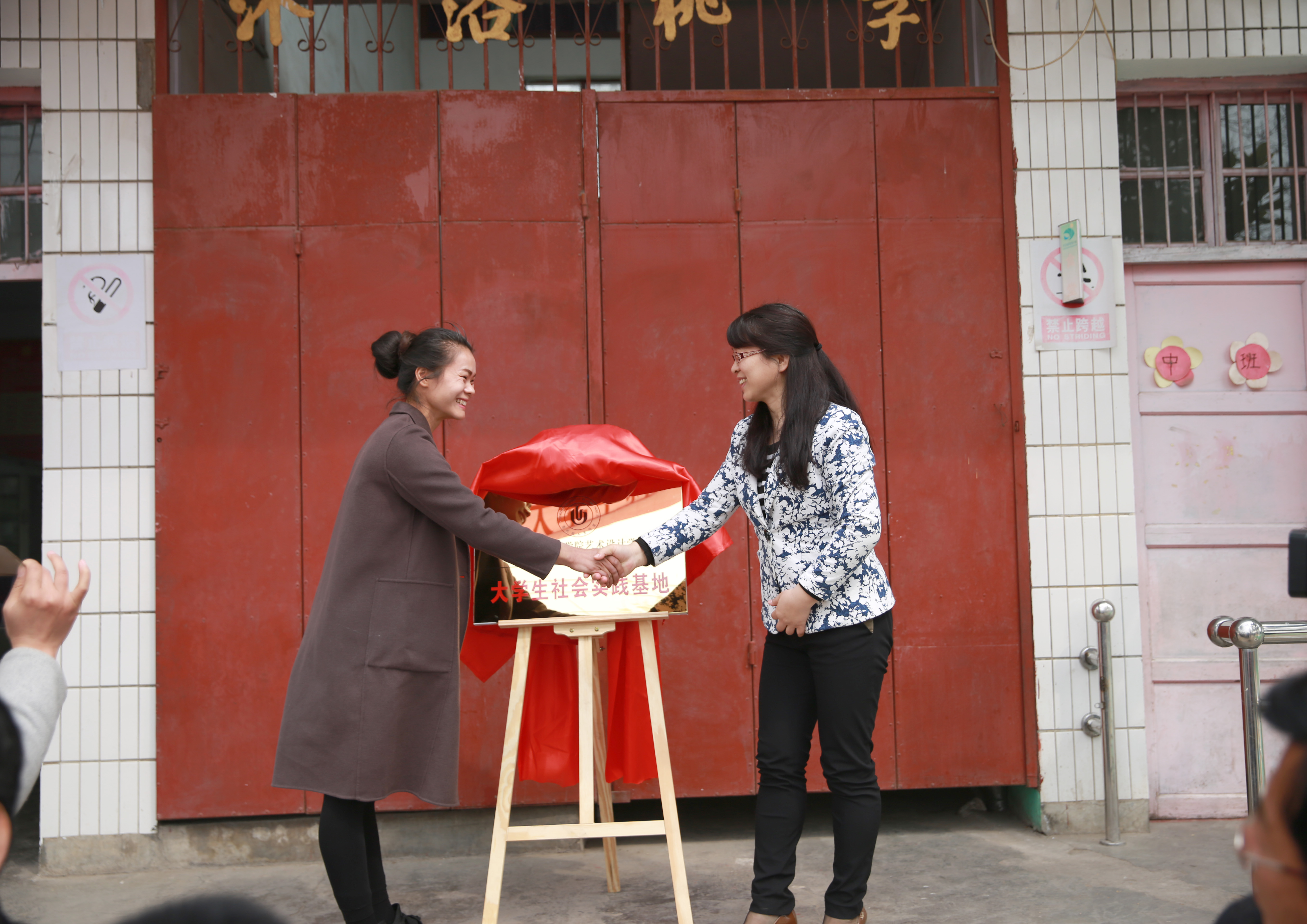 仪式现场,艺术设计学院与观音堂小学共同签订了建立大学生社会实践基地的协议书,张莉副书记与王变变校长为基地揭牌,仪式最后艺术设计学院向观音堂小学捐赠了文具用品。
