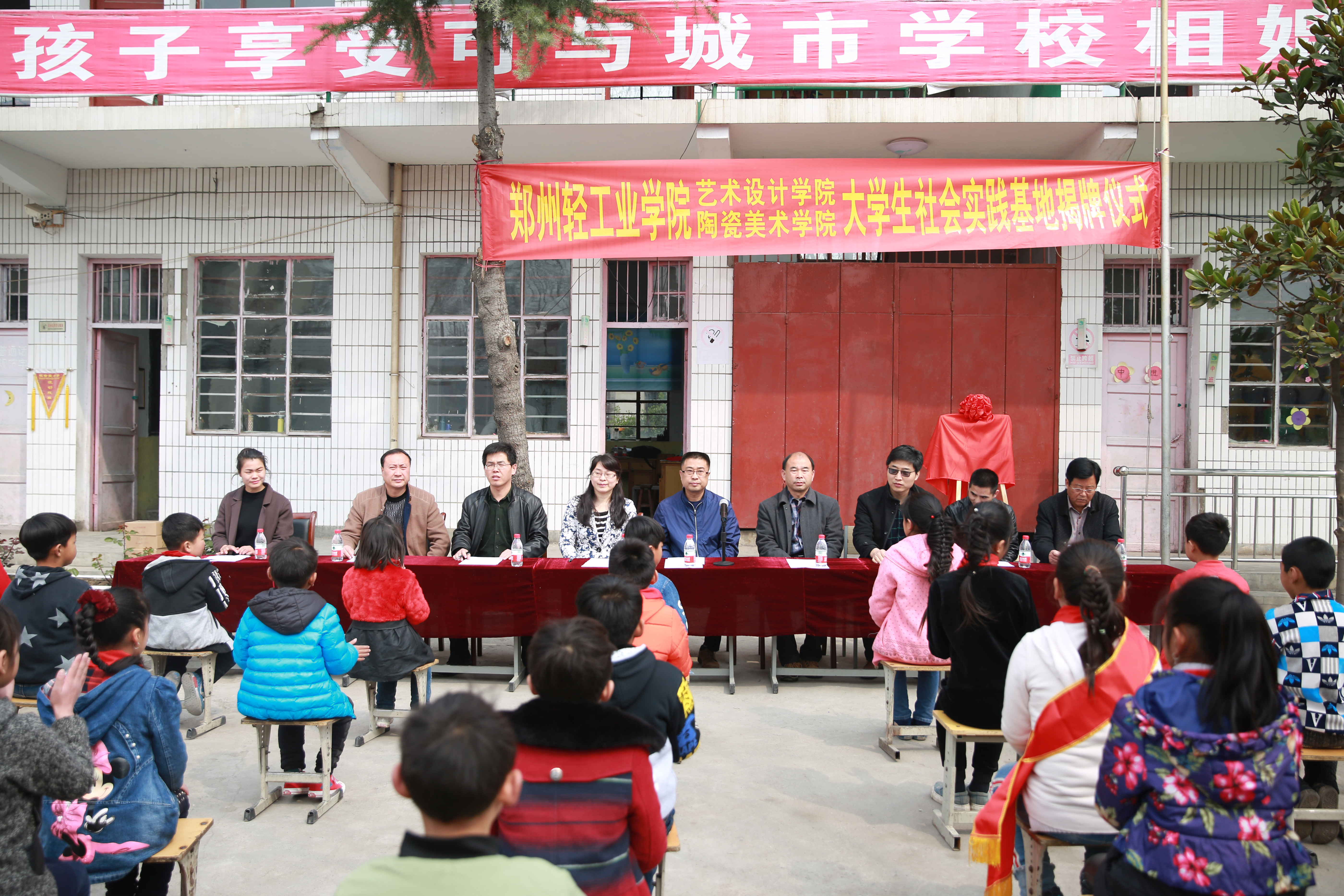 禹州市文广局副局长孙国选出席仪式并发表讲话、花石镇教育党总支领导以及花石镇观音堂小学全体师生参加了揭牌仪式。观音堂小学校长王变变在致辞中回顾了观音堂小学由濒临倒闭到今天焕然一新的艰苦重建历程,对艺术设计学院给予的支持和帮助表示感谢,对将要开展的校地合作充满希望和信心。艺术设计学院党总支书记邵元珠在讲话中介绍了轻院以及艺术设计学院、陶瓷美术学院的发展情况,强调了大学生社会实践的重要意义,对参加社会实践和志愿服务的大学生提出具体要求。艺术设计学院研三学生郎世峥作为学生代表做了发言。