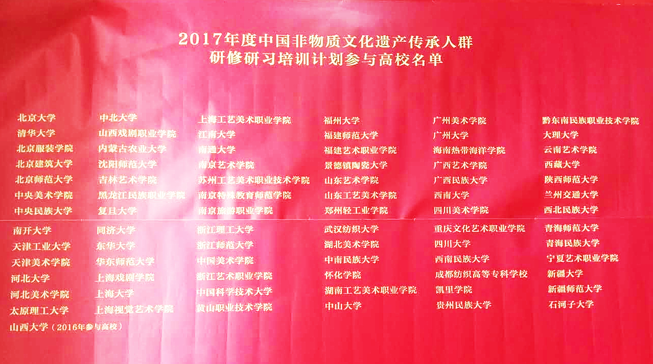 2016年经文化部和教育部商议,正式部署实施中国非物质文化遗产传承人群研修研习培训计划。郑州轻工业学院,成为首批入选57所非遗传承人委托培训计划的高校之一。作为河南省唯一一所入选该项目的高校,郑州轻工业学院始终立足于中原及周边地区传统艺术文化研究,致力于非物质文化遗产保护、研究与文化创意产业开发,并在非遗传承人培训方面不断完善课程设置,建立了一套针对非遗传承人培训行之有效的教学体系,此前的五期培训成果显著。