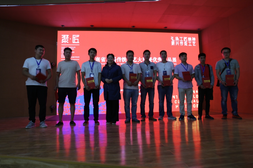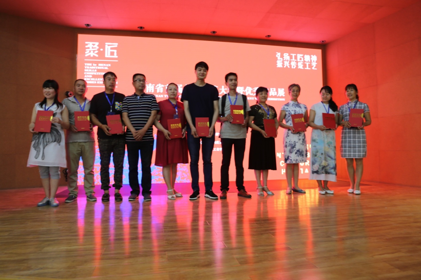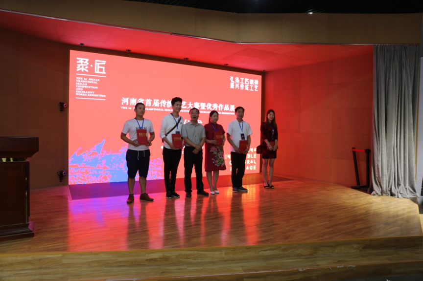 大赛结束后,文化厅孙鹏副厅长、非遗处刘春晓处长、郑州轻工业学院王新杰副校长登台为选手们颁发荣誉证书并合影留念。至此首届河南省首届传统技艺大赛圆满结束。此次大赛的设置不仅是为了展现手工艺人们的精湛技艺,更多的是为了交流切磋创意,传播河南传统文化的魅力,更好的传承与发展中华优秀传统文化,振兴河南传统技艺。