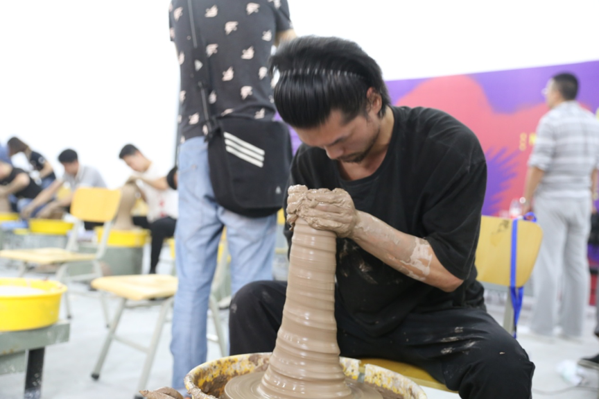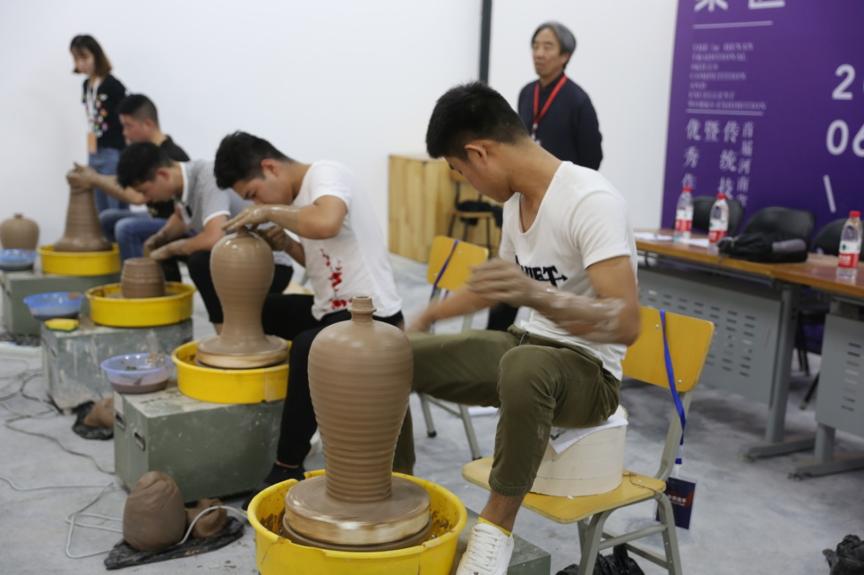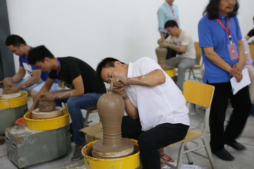 手工拉坯大赛区,选手们要求在20分钟内完成1000px的传统梅瓶制作。陶艺大师们技巧熟练自如、注重细节,在短短的几分钟内迅速成型,作品器形优美,颇具美感。经过5位陶瓷评审的独立打分统计后,最终角出一等奖三名:车吉平、王文珂、钱宗源;二等奖五名:李佳龙、李向垒、李银龙、温炎鹏、王蒙阳;三等奖十名:王晓兵、卫寒兵、郑凯阳等。