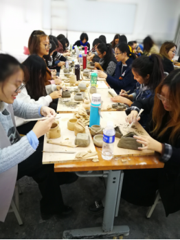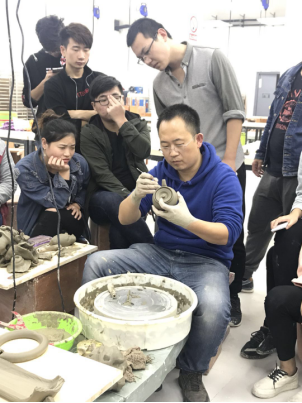 第一周,带领学生深入考察当地著名钧瓷企业(孔家钧窑、坪山钧窑、大宋官窑和锦丰源钧窑),学习、观摩,与企业设计师和管理人员交流,并参与到钧瓷的整个设计制作过程中。同学们也参观了禹州实训基地的陶瓷拉坯实验室,了解了陶瓷制作的基本工艺。下午在老师的指导下,同学们动手实践,学习了盘条和泥板成型的制作方法。这次考察,钧瓷的“入窑一色,出窑万彩”给每位同学留下了深刻的印象,同学们真正的感悟到了钧瓷的艺术魅力,这对于后续的设计有良好的帮助。