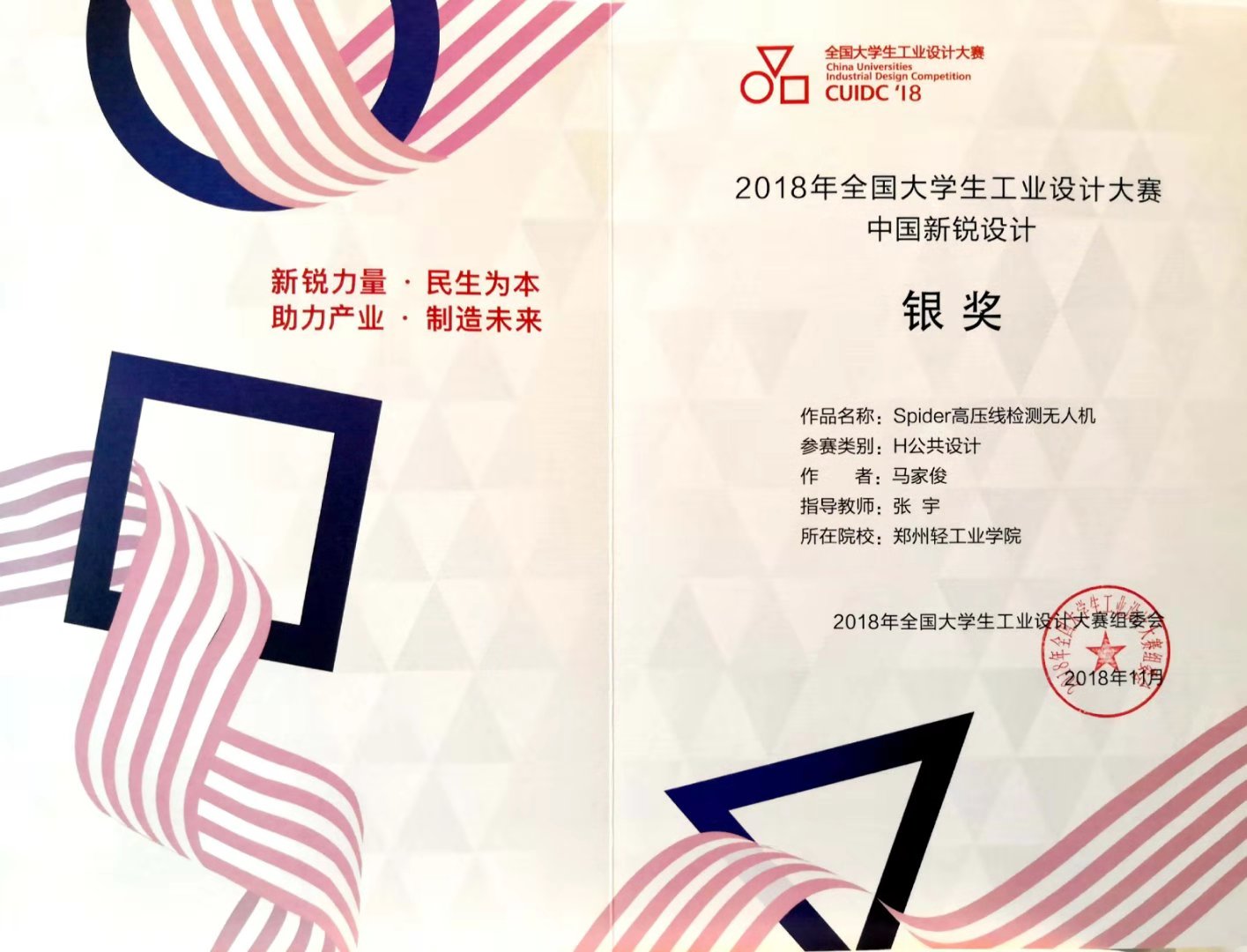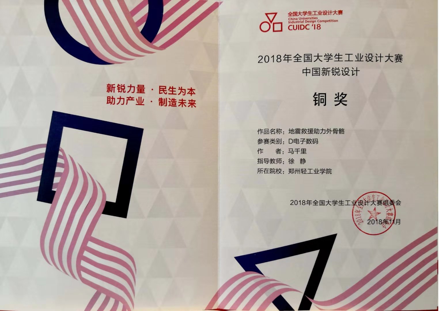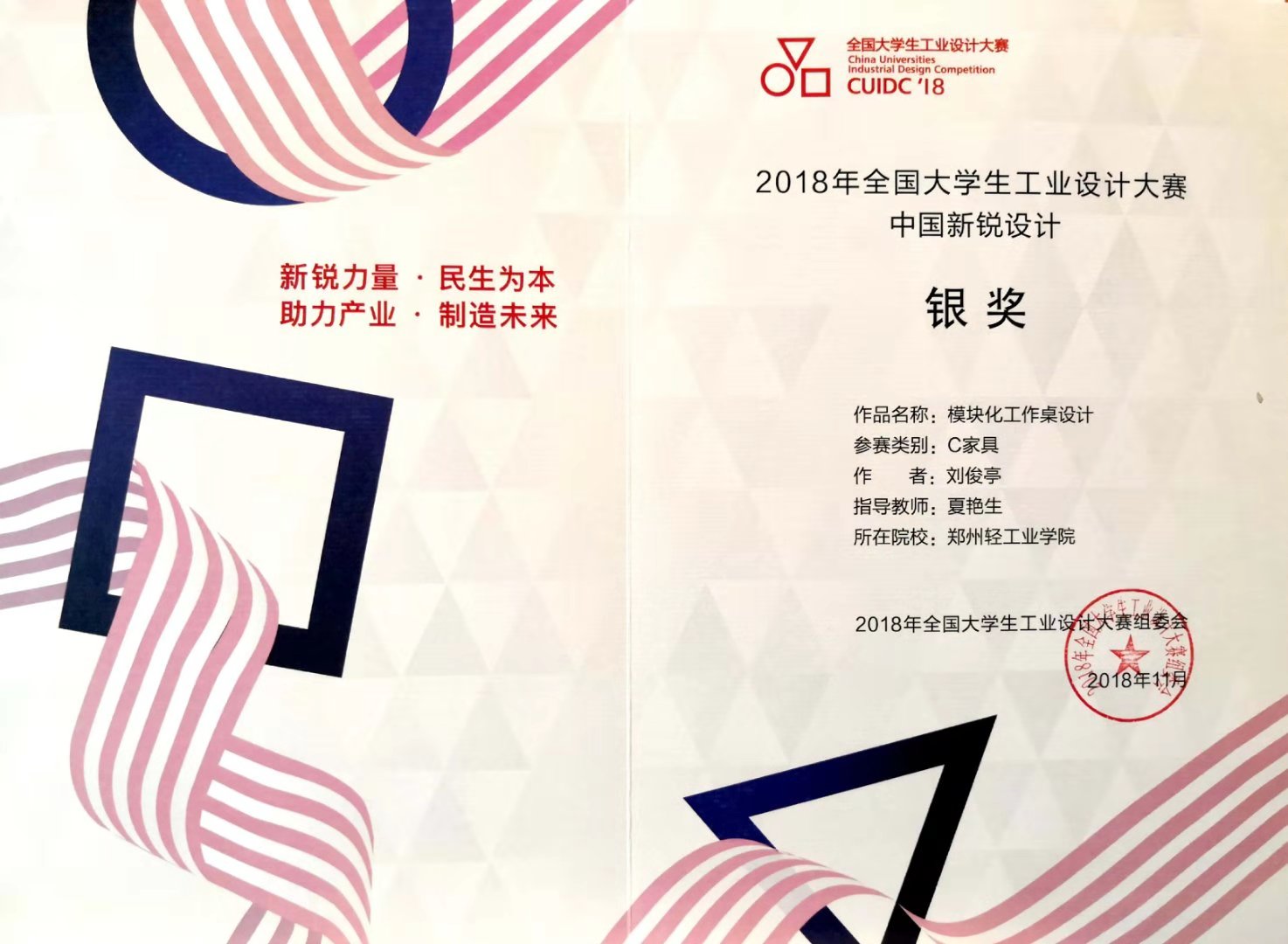 11月23日,2018年全国大学生工业设计大赛颁奖典礼在广州美术学院举行。我校艺术设计学院学生作品在众多作品中脱颖而出,喜获全国总决赛银奖两名、铜奖两名、优秀奖两名的好成绩。