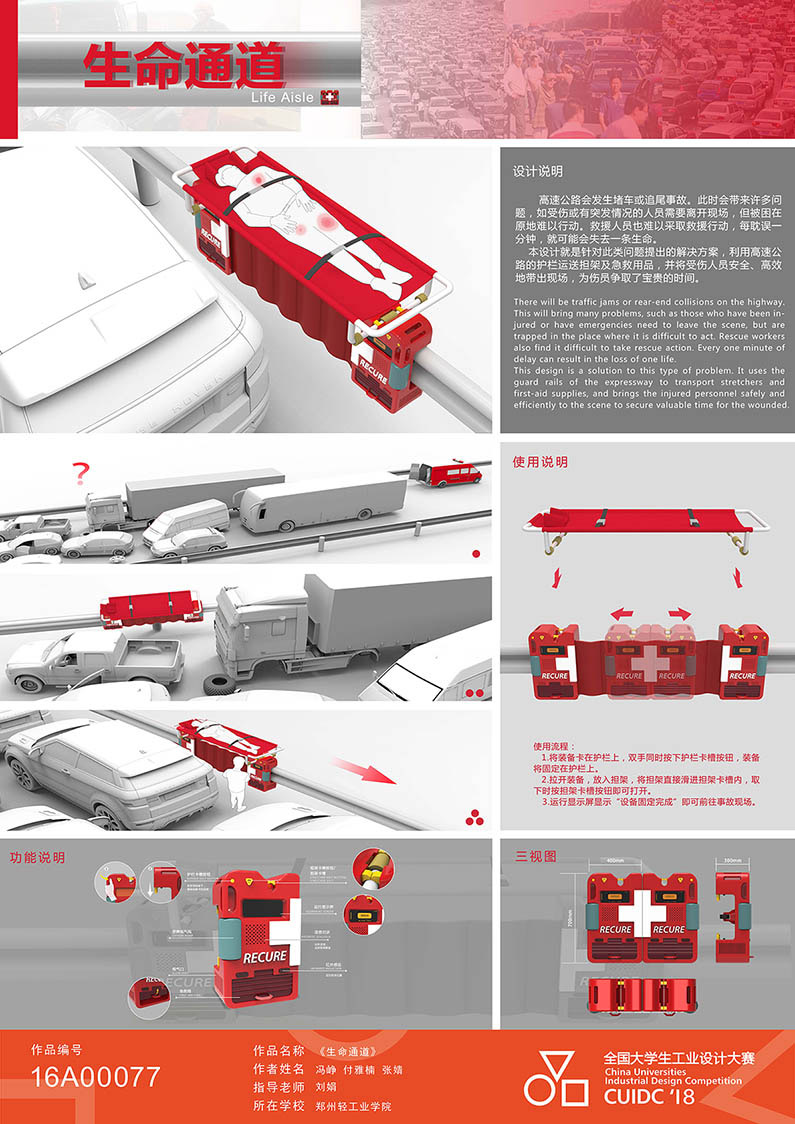设计说明:高速公路有时会发生堵车或追尾事故,此时会带来许多问题,如受伤或有突发情况的人员需要离开现场,但被困在原地难以行动,每耽误一分钟,就可能会失去一条生命。本设计就是针对此类问题提出的解决方案,利用高速公路的护栏运送担架及急救用品,并将受伤人员安全、高效地带出现场,为伤员争取了宝贵的时间。
