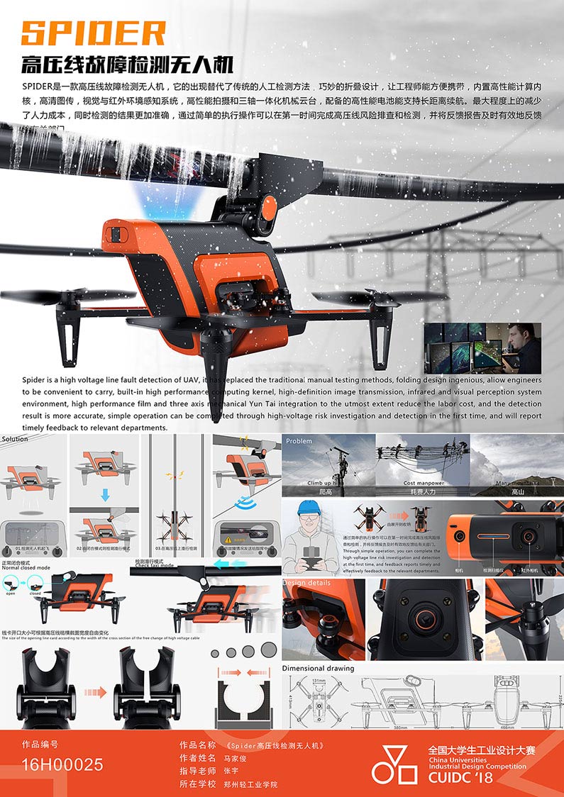 设计说明:Spider是一款高压线故障检测无人机,它的出现替代了传统的人工检测方法,巧妙的折叠设计,让工程师能方便携带,内置高性能计算内核,高清图传,视觉与红外环境感知系统,高性能拍摄和三轴一体化机械云台,配备的高性能电池能支持长距离续航。Spider最大程度上的减少了人力成本,同时检测的结果更加准确,通过简单的执行操作可以在第一时间完成高压线风险排查和检测,并将反馈报告及时有效地反馈给有关部门。
