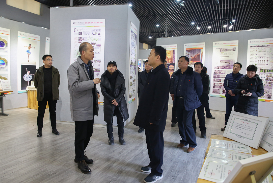 郭鹏书记一行首先到艺术设计展厅观看了设计专业优秀师生作品展,随后进行了交流。副校长王新杰对郭书记一行的到来表示热烈欢迎,并就学校发展历史、特色专业、社会服务、更名大学,特别是设计专业人才培养、校地合作、社会影响等工作进行了概括介绍,对修武县近年来大力提倡“全域美学”发展理念,倡导“创新、协调、绿色、开放、共享”的旅游经济观念给予了高度赞扬,认为修武县与我校艺术设计学院合作空间很大,学校将会进一步整合资源做好支持工作。