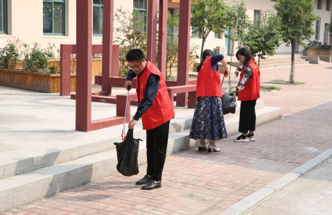 活动开始前,全体教工党员在东四楼307开展动员大会,并有序领取志愿者工作服和卫生工具。志愿活动中,大家来到校园东侧的教学楼附近,集中开展环境卫生综合整治工作,有的负责清理不常被注意的卫生死角,有的回收草丛中的塑料瓶和长时间被放置在楼道口硬纸板,还有部分老师在垃圾桶旁向来往的同学们普及垃圾分类知识。党员同志们不畏蚊虫叮咬,也不怕脏累,充分发挥党员不怕苦,不怕累的精神,各司其职,有条不紊的完成此次志愿服务工作。