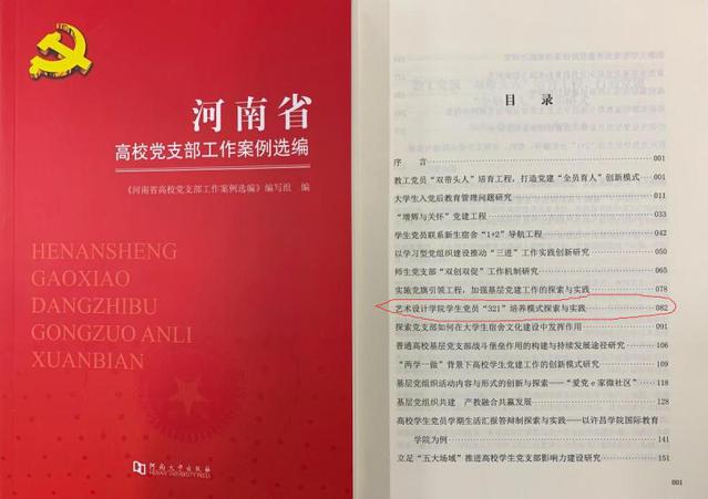 近日,河南省委高校工委组织编写了《河南省高校党支部工作案例选编》,该《选编》从全省高校申报的204个党建创新项目中遴选集结了25个具有创新性、可操作性、典型性的案例。我校艺术设计学院党总支选送、学校党委组织部推选的基层党建工作创新项目《艺术设计学院学生党员“321”培养模式探索与实践》成功入选。这也是我校唯一入选的工作案例。